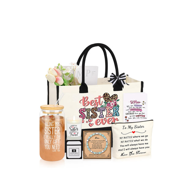 - 【Sister Gifts Basket Contains】6 items in this gifts set have been handpicked by us which contains 1 stylish tote bag, 1 practical canvas makeup bag, 1 16 Oz glass cup with lid and straw, 1 cute amazonite bracelet, 1 soy wax Lavender scented c**dle and 1 greeting card to write what you want to say. Show your love to the best sister with this thoughtful gifts set!