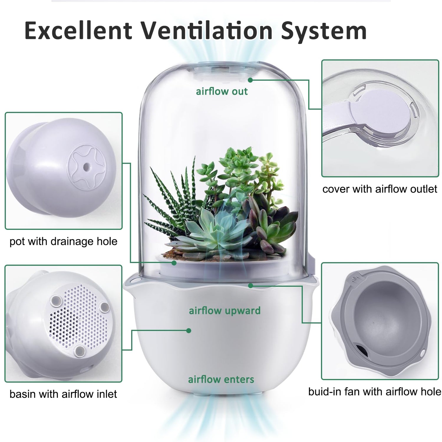 - 【Special Design Terrarium For Succulents, Carnivorous Plants & Venus Fly Trap, Butterwort Plant】 LED grow light for Enough Lighting,build-in fan for Better Ventilation, and the transparent cover make a good air Circulation System. All of the designs offer a suitable condition for succulents, promotes photosynthesis, and grows well and faster.