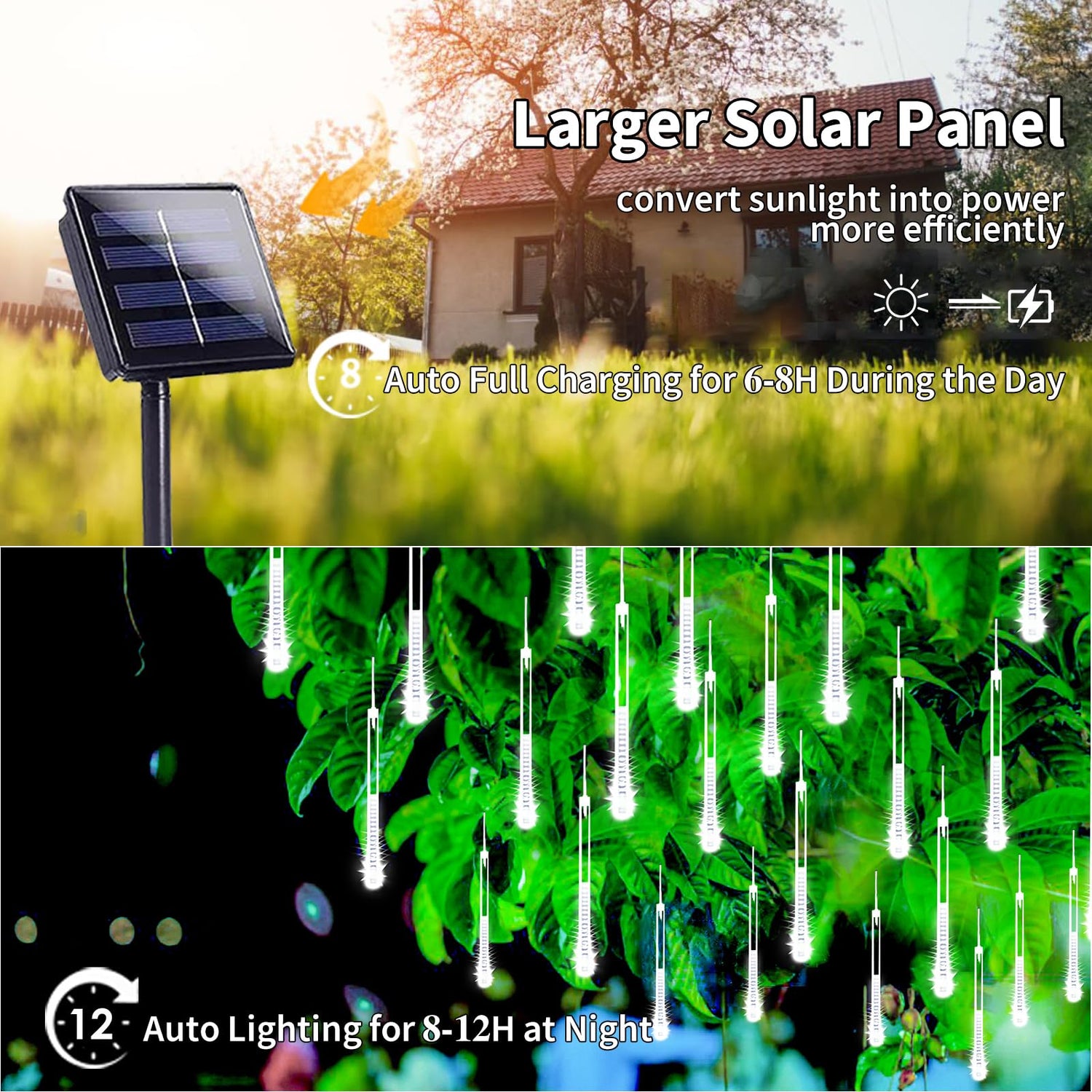 - Auto ON/OFF & Long-Lasting: The solar panel absorbs sunlight throughout the day, automatically turning lights on at dusk and off it at dawn. With a full charge of 6-8 hours under direct sunlight, the solar meteor lights provide up to 8-10 hours of illumination at night—perfect for everyday use
