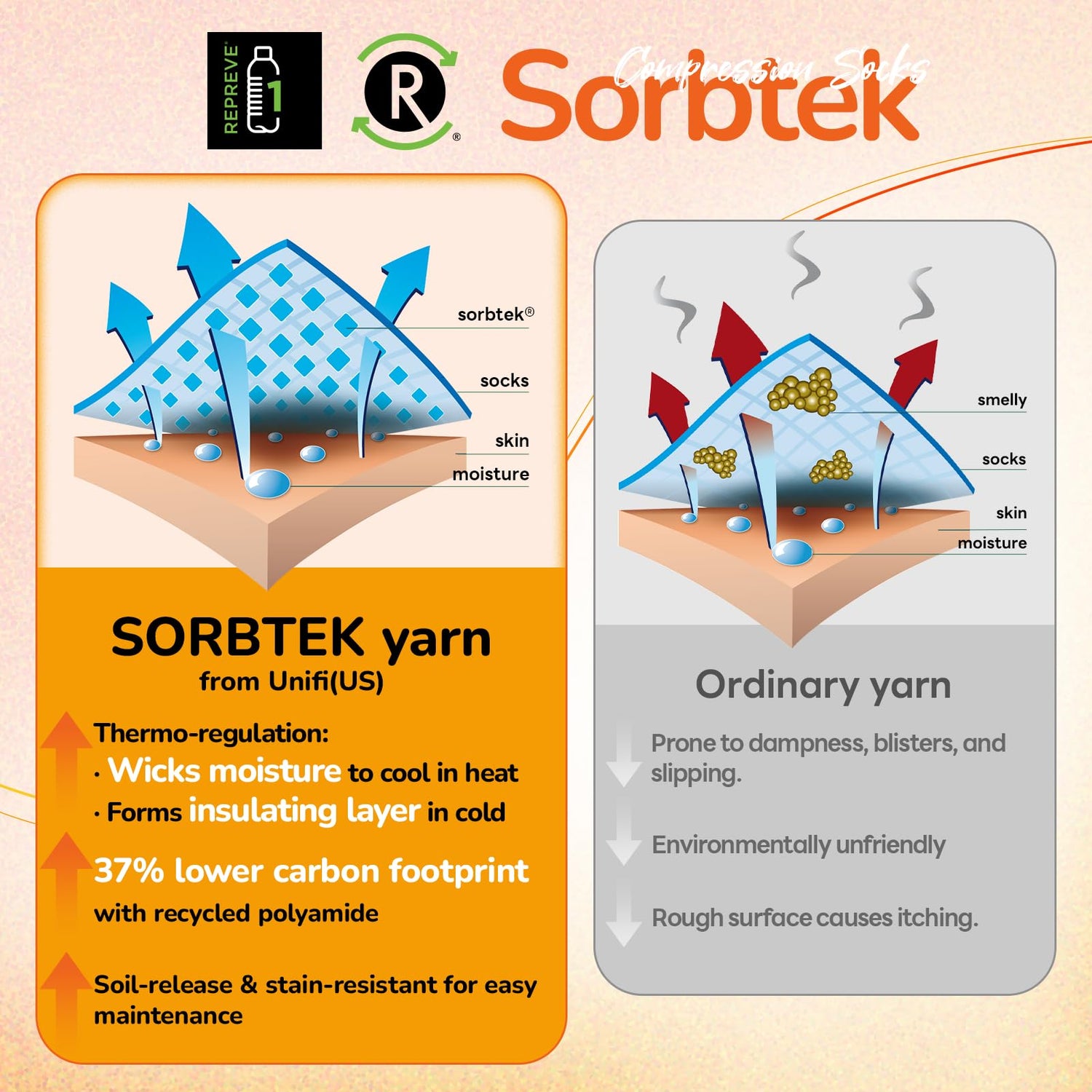 • REPREVE Sorbtek:Stay cool, dry, and comfortable all day long with innovative REPREVE Sorbtek moisture-wicking fibers from USA. These advanced yarns are specially engineered to quickly draw sweat and moisture away from your skin, helping to regulate temperature and prevent odor. Whether you’re working, traveling, exercising, or spending hours on your feet, these socks keep your feet feeling fresh, dry, so you can focus on your day with total confidence and ease.