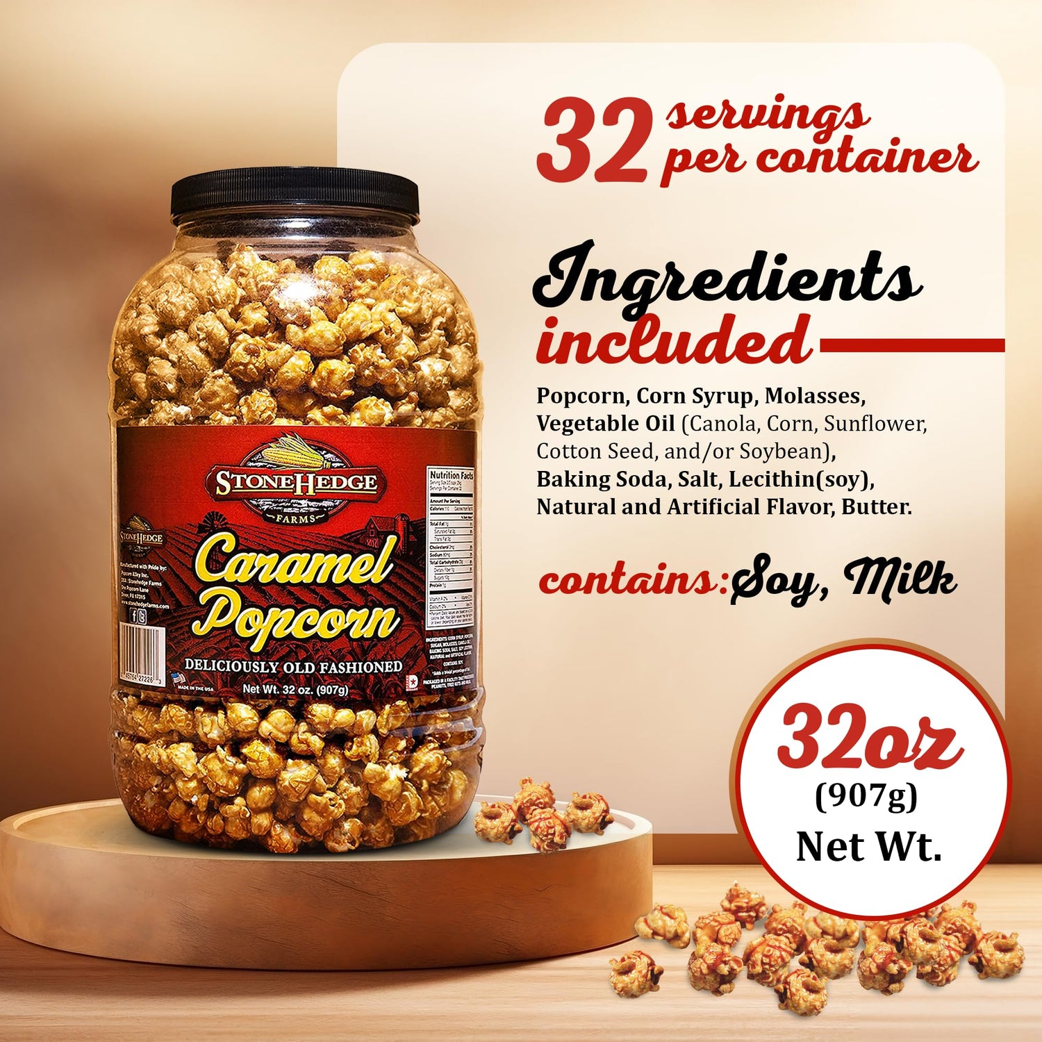 Stonehedge Farms Caramel Flavored Popcorn | 32 oz Large Tub | Perfect for Holidays and Christmas | Bulk Gourmet Popped Sweet Snacks | Made in the USA