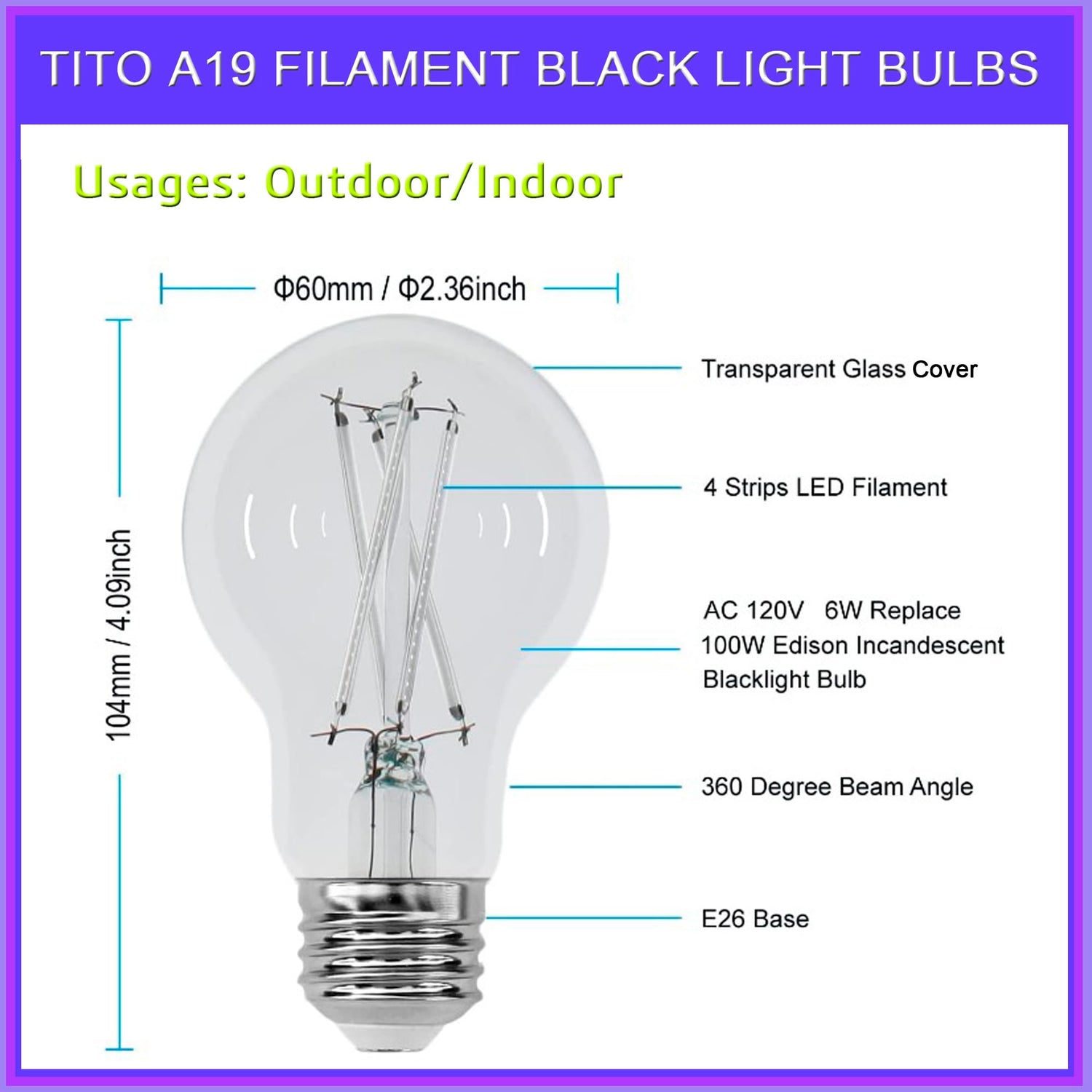 • Illuminate your space with 4 individually wrapped colorful TITO E26 A19 Filament LED Black Light Bulbs