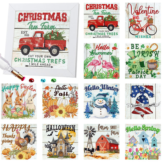 - Interchangeable Seasonal Diamond Painting Kits: includes a set of 12 interchangeable seasonal diamond painting kits along with a frame; There are also 12 sets of tools that go with it; Our diamonds and tools are distributed according to the canvas, and one canvas with a set of tools ensures that you can easily make diamond paintings all year round