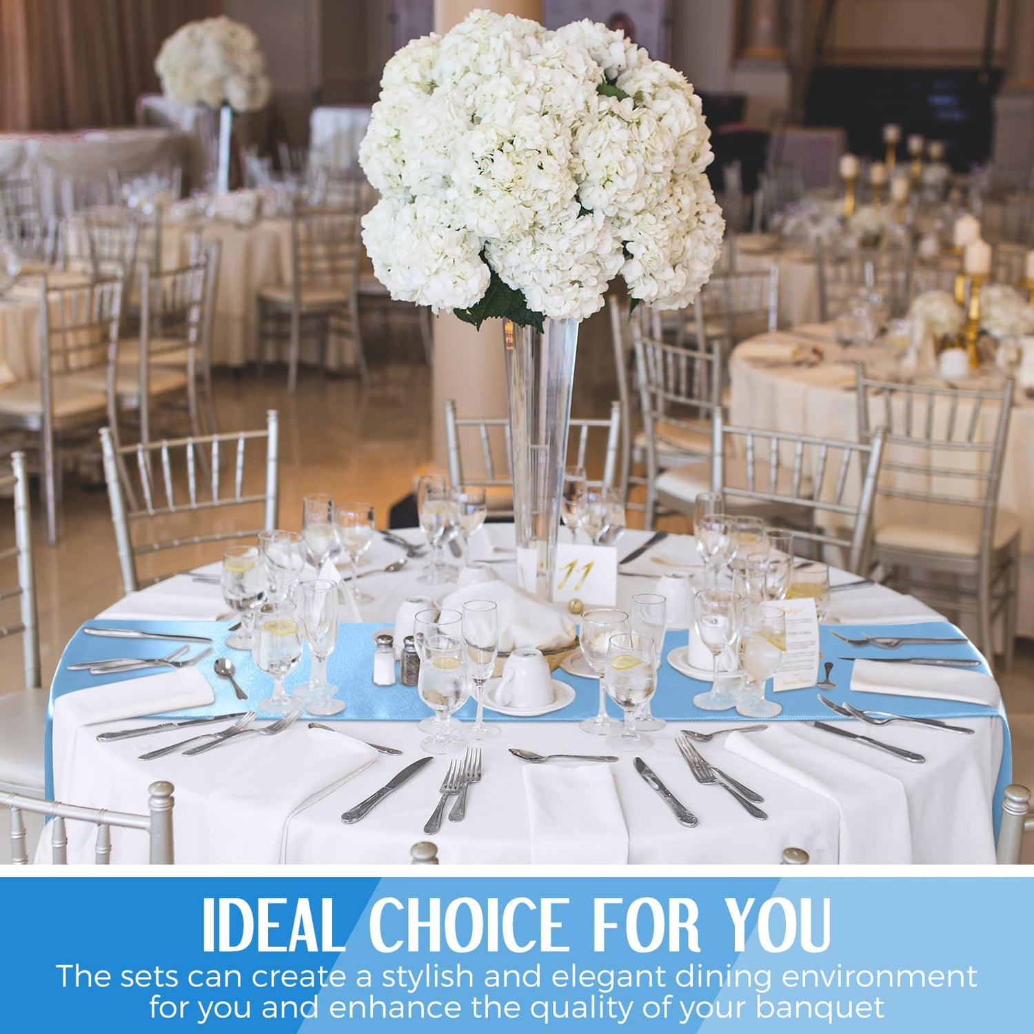 Tudomro 16 Pcs White and Light Blue Round Plastic Tablecloth and Satin Table Runner Set 84 Inch Round Covers 12 x 108 Inch Table Runners for Christmas Wedding Birthday Party Baby Shower is backordered and will ship as soon as it is back in stock.