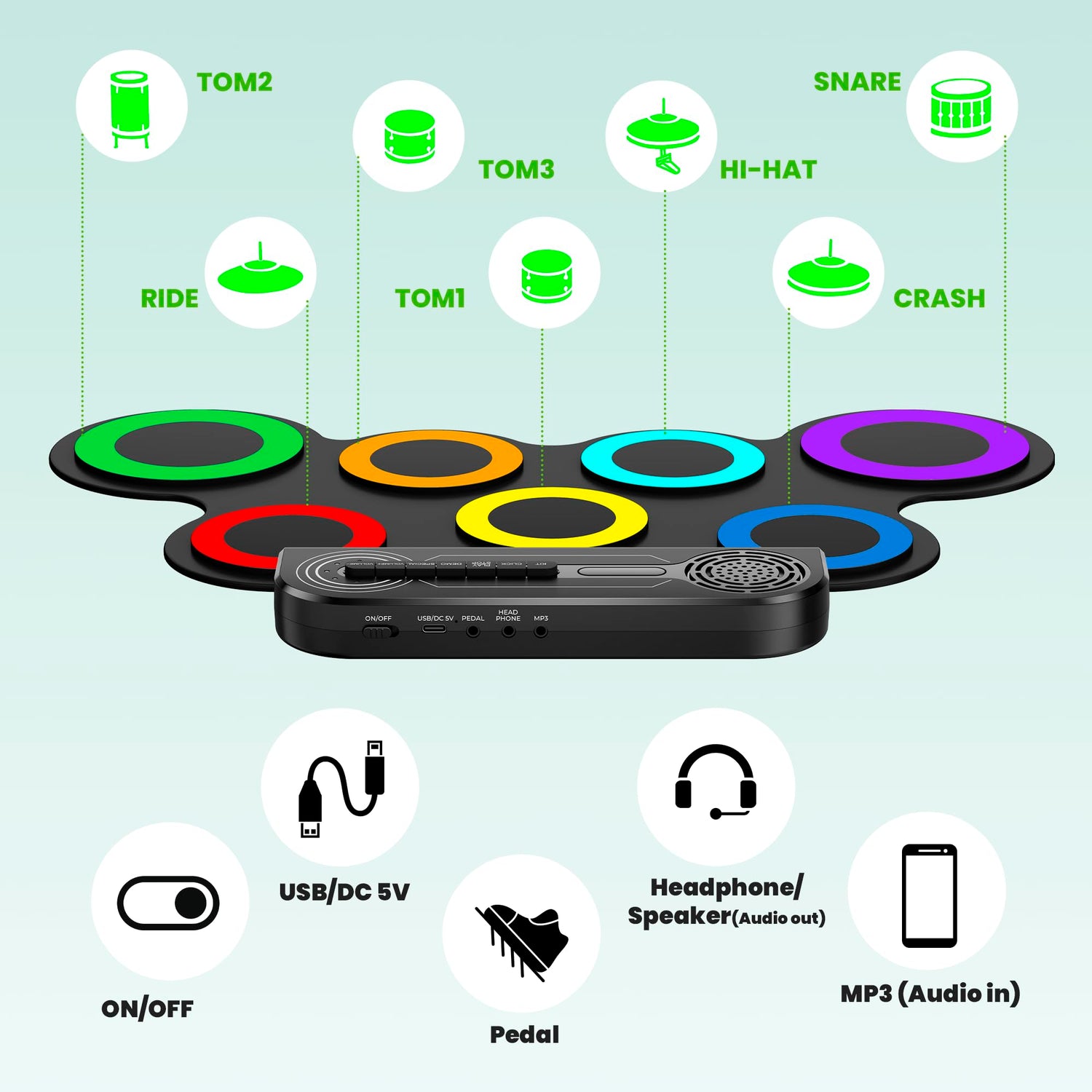 • šŸŽµć€Portable and Easy to Use怑This silicone electronic drum kit is easy to operate and carry. You can roll it up and put it in your bag, so you can practice at any time, such as on an outdoor picnic, at a friend's gathering, during a music drum class, even when you are bored all by yourself.