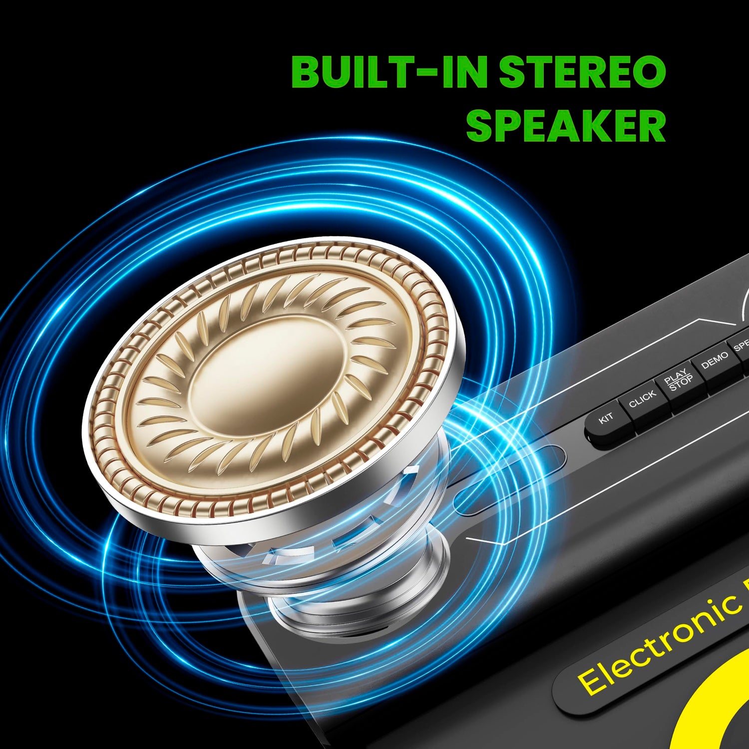 • šŸŽµć€Built-in Stereo Speaker怑The electric drum is equipped with upgraded stereo speakers, 10 levels of volume adjustment, providing you with astonishing bass effects. You can freely share your music and creations with your family or friends, and they will cheer for you and be proud of you.