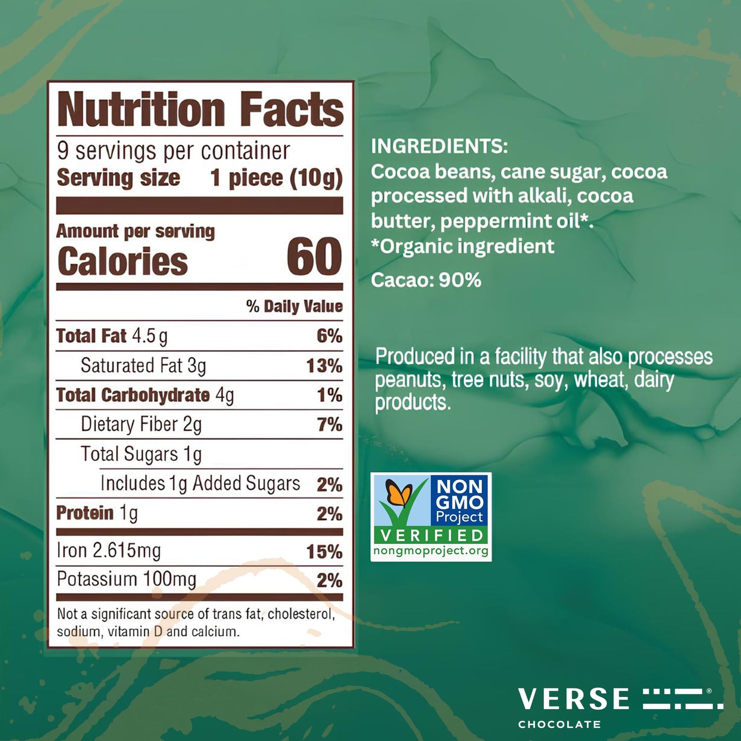 Verse 90% Dark Chocolate Mint Squares - Only 1g Cane Sugar - Creamy Dark Cocoa - Individually Wrapped Cacao Chocolate Squares (9 Count, 2 Pack)