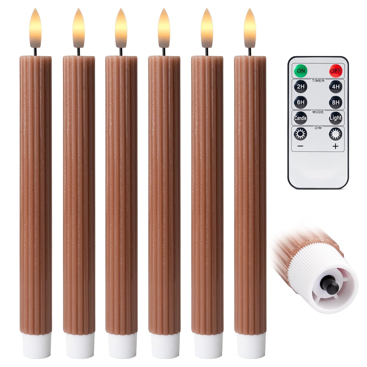 West Ivory 6 Pack, 10" LED Flameless Brown Tan Fluted Ribbed Grooved Taper Candles, Remote & 24h Timer Memory, On/Off Button, Dimmable, Flicker Mode, Battery Operated, Christmas Menorah Wedding