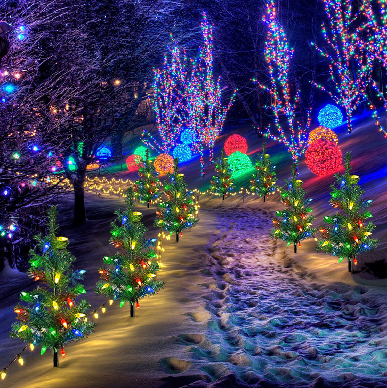 - 【Upgraded Christmas Stake Lights】4-IN-1 Christmas tree stake lights, each tree stake is 29 inches high, with 20 leds multi-color C6 strawberry, the distance between each tree stake is 2m/6.56ft, lead wire is 2m/6.56ft, very bright color eye-catching, very Christmas festive display, perfect outdoor Christmas Decorations.