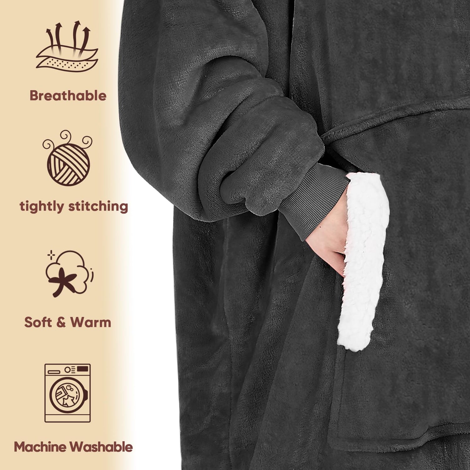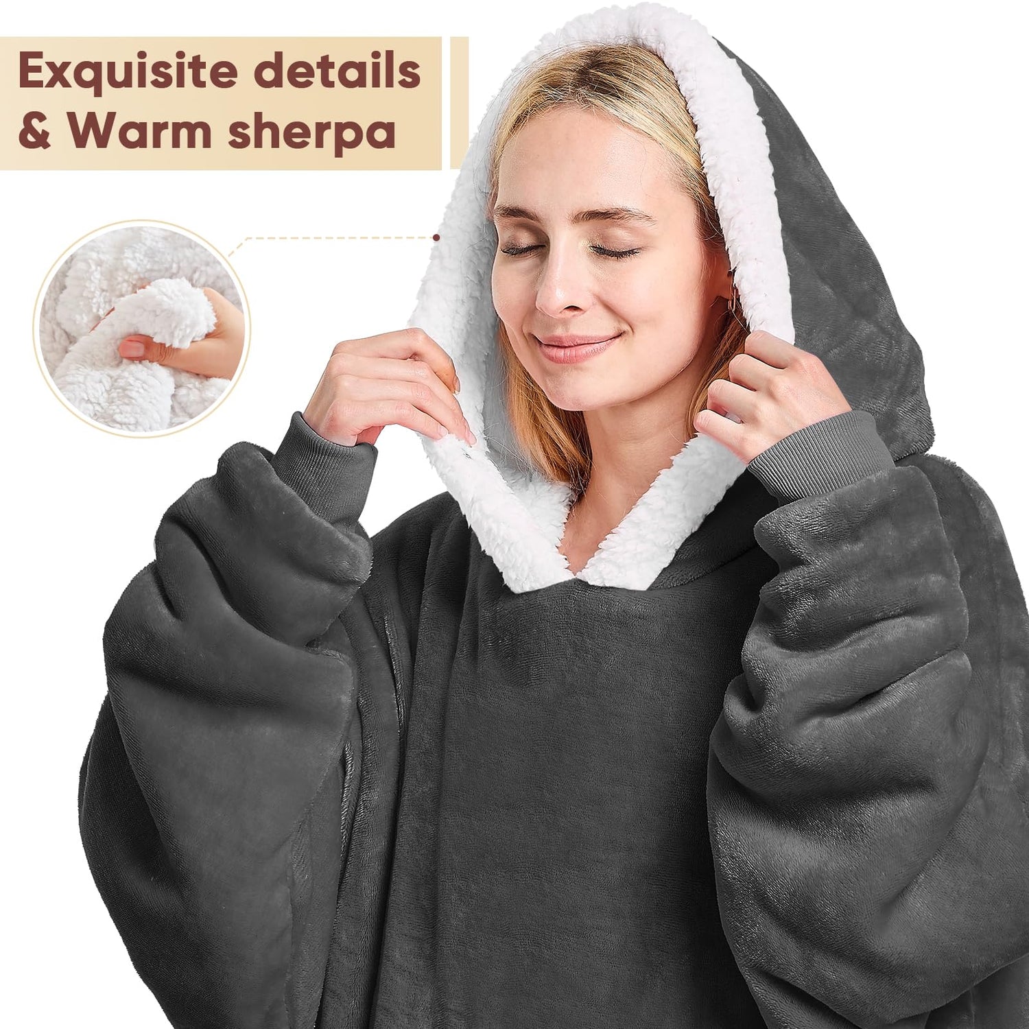 yescool Wearable Blanket Hoodie - Birthday Christmas Gifts for Women Mom Girlfriend, Oversized Flannel Sherpa Cozy Hooded Blanket Sweatshirt Adult With Hood Pocket & Sleeves, One Size Fits All (Grey)