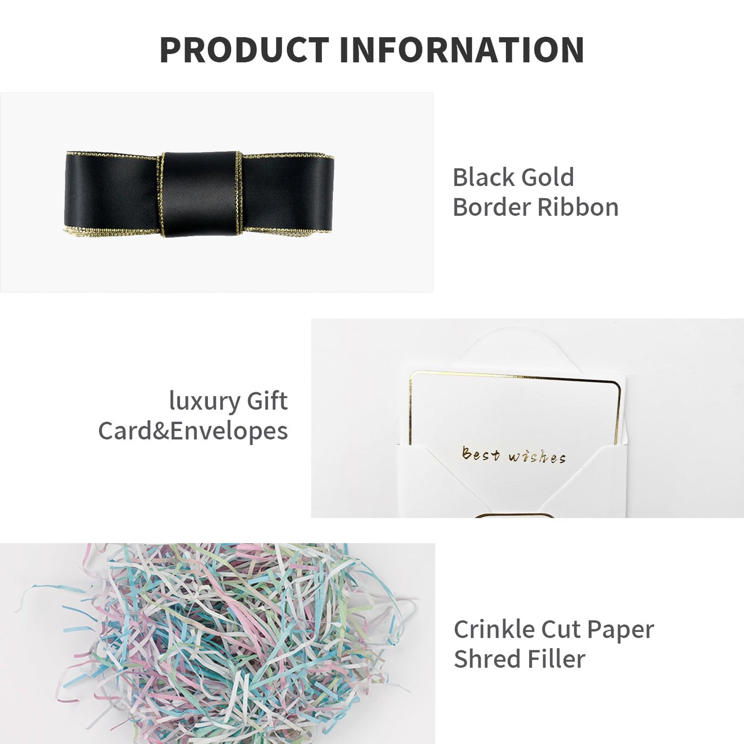 • Package Contains-1*Black gift box,1*Gift Card&Envelopes,1Pack Shredded Paper Filler,118inch Luxury Ribbon.We Have Everything You Need.Please check the size whether it meet your needs or not before purchase.