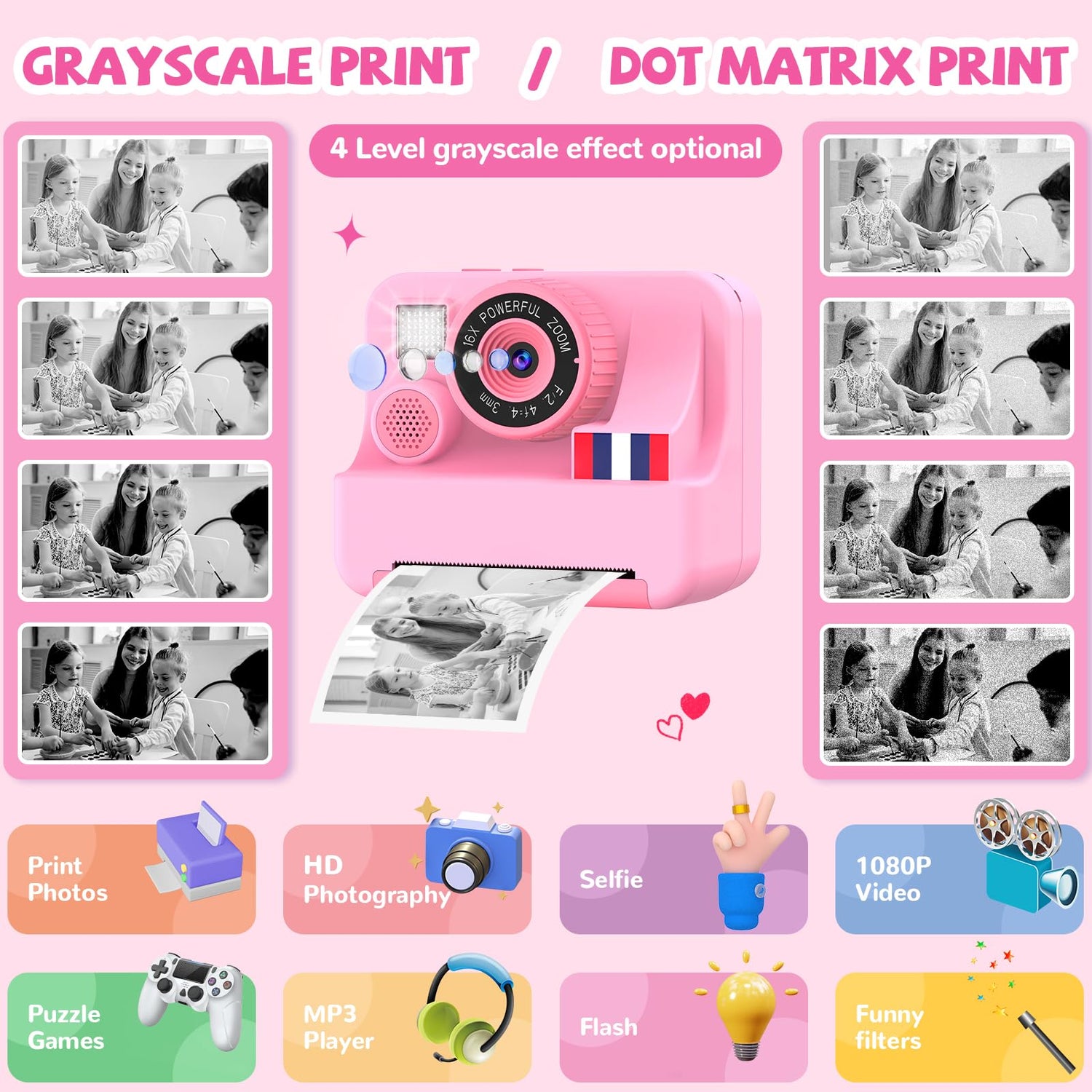 • Creative Comic Printing Camera - Upgrade comic print feature, Without drawing skills, you can generate black and white line drawings with gray surfaces removed, and you can directly color or put on stickers to create picture and comics. It's a gift that inspires artistic expression, perfect for little creators.