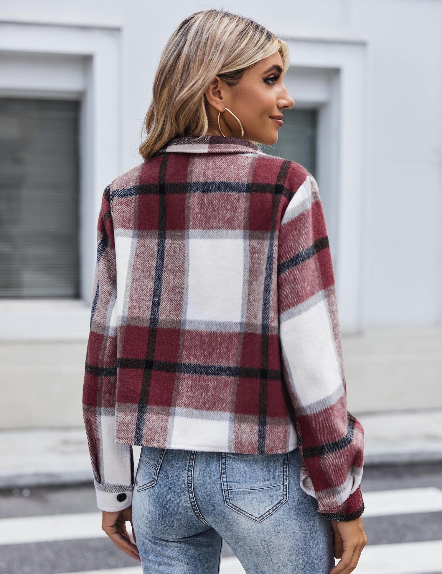 Zeagoo Women's Fashion Cropped Shacket Jacket Wool Blend Plaid Button Down Shirt Fall Christmas Jackets Coat