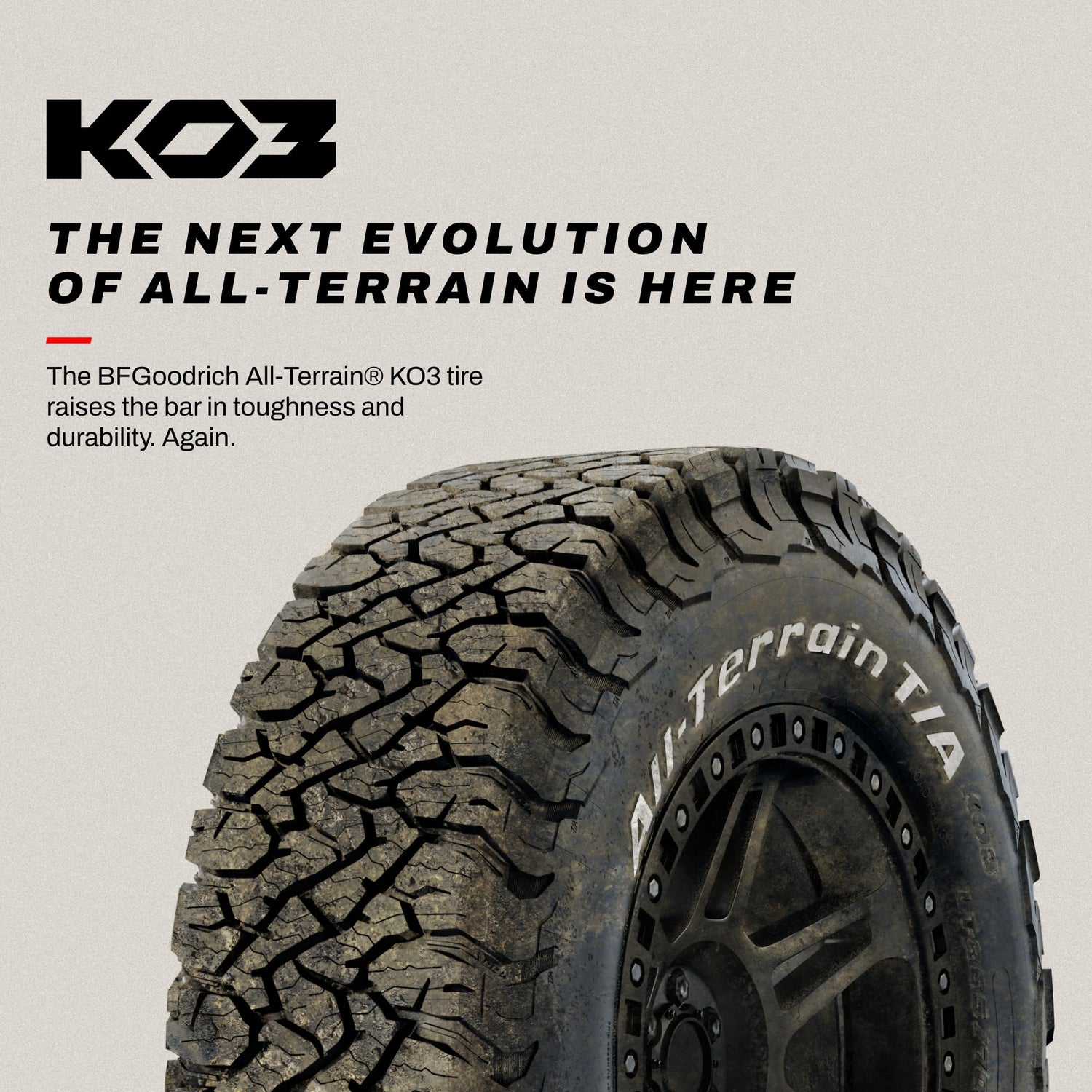 • LEGENDARY TOUGHNESS, MADE TOUGHER: The next evolution of all-terrain tires is here. The BFGoodrich All-Terrain T/A KO3 tire raises the bar in toughness and durability. Again.
