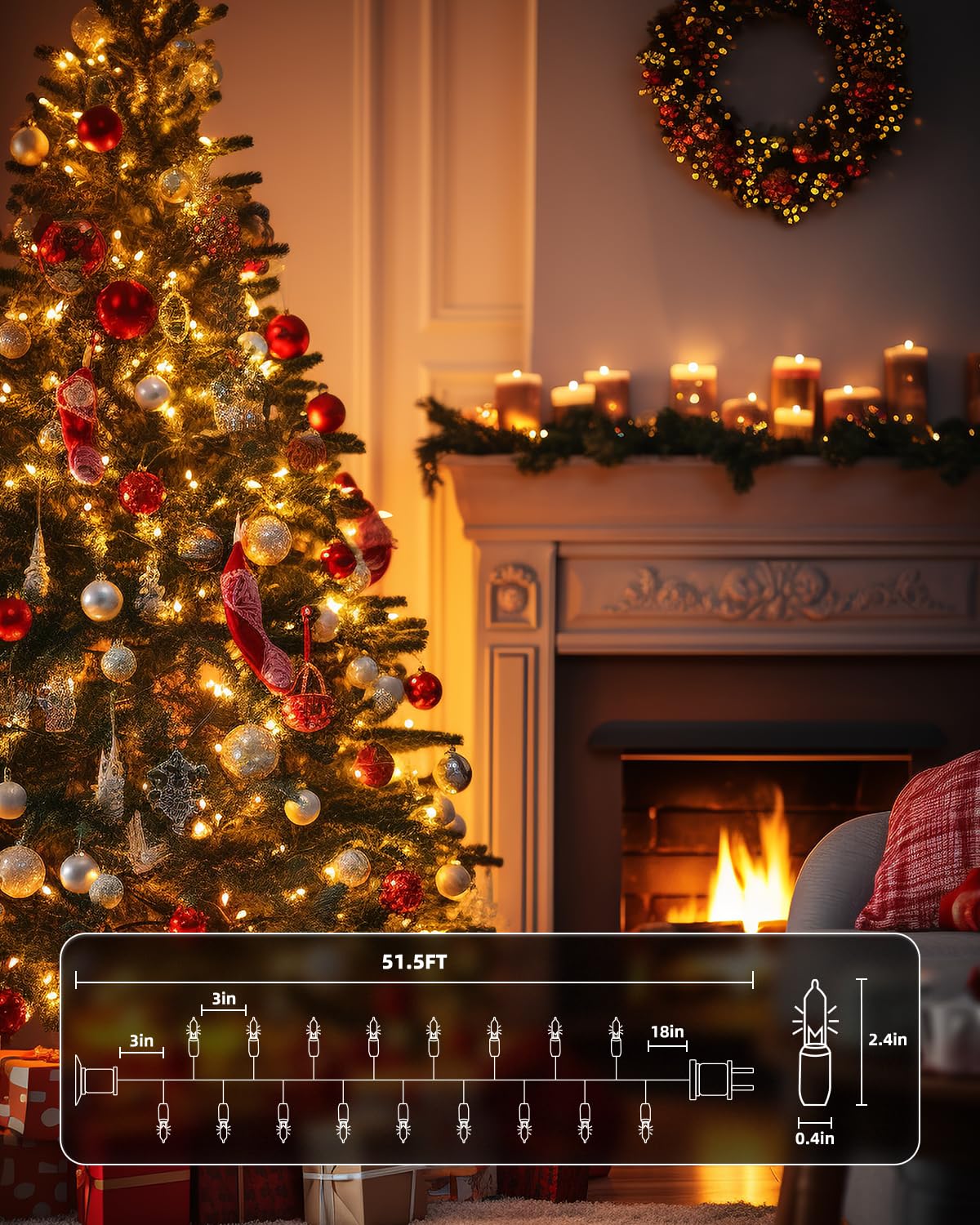 • 【Festive Mini Christmas Lights Set】This set includes 200 transparent incandescent mini-lights on 51.5 ft white wire, with bulbs spaced 3-inche apart and 18-inch lead wire. Perfect for holiday decorating, with the ability to connect up to 2 light strings end-to-end;