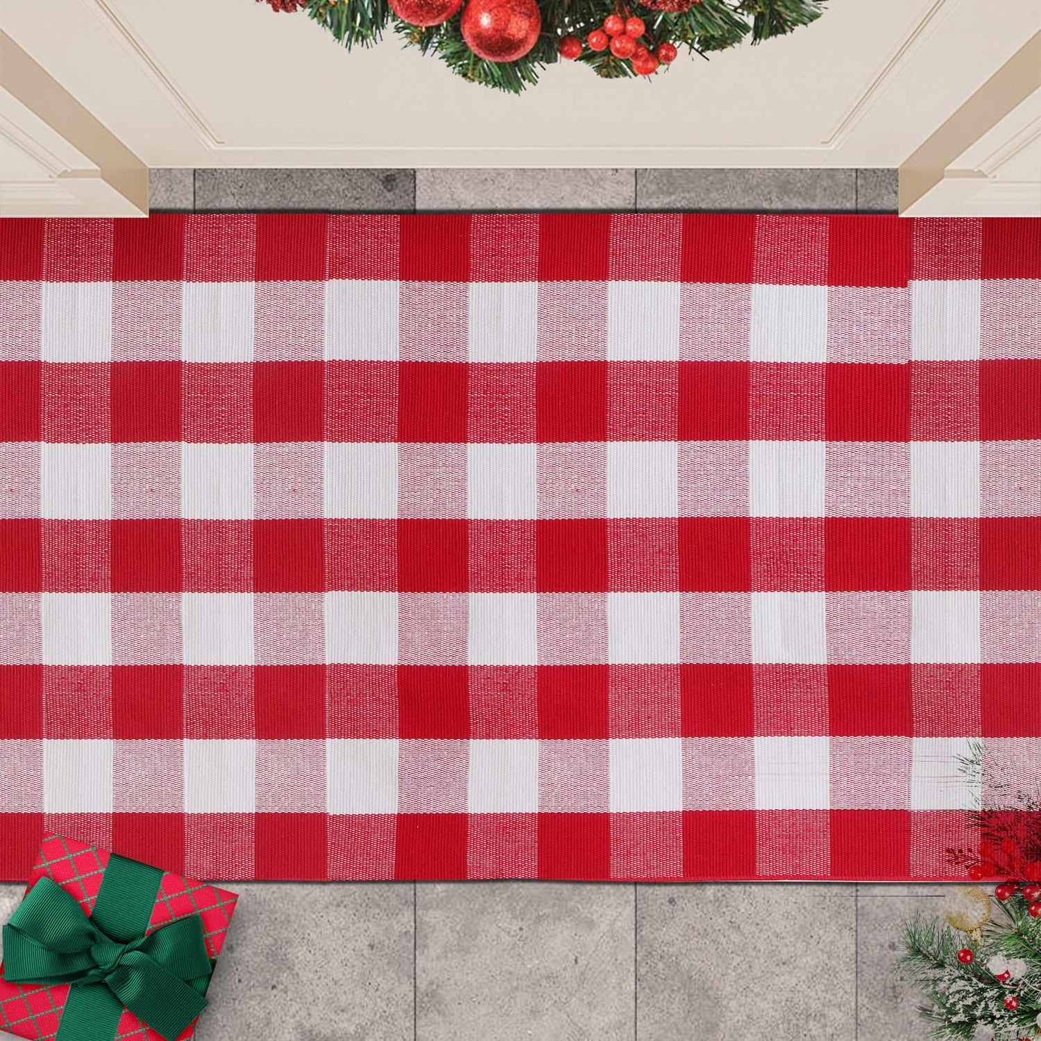 Christmas Red and White Plaid Rug 3 x 5 Ft, Hand-Woven Indoor/Outdoor Layered Cotton Blend Buffalo Plaid Rug, Washable Front Door Mat, Perfect for Porch, Living Room, Entryway