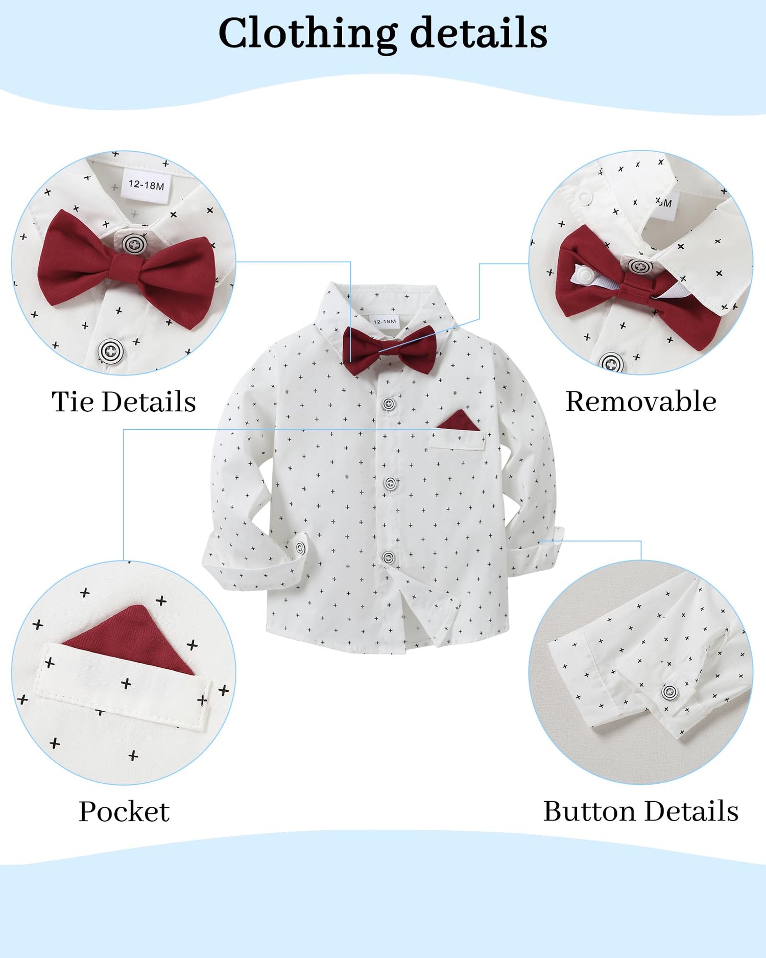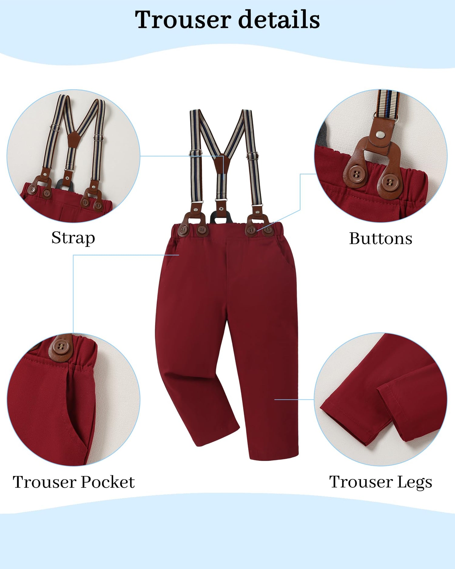 - Gentleman Design: Our 3 pcs baby boy formal outfits include 1* dress shirt, 1*suspenders pants and 1*removable bow tie. It's designed specifically for baby boys which allows to attend various formal occasions.