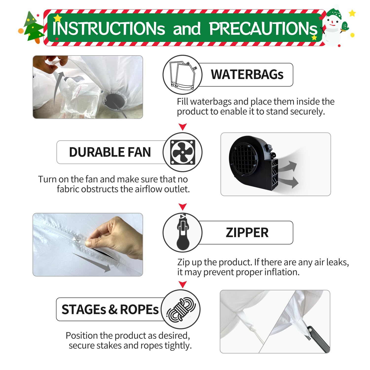 - 【Easy Setup and Storage】Self-inflates and deflates. Just plug in the built-in fan, secure it to the ground, and it inflates within seconds. Put in water bags and ropes for stability, no worries about wind blowing the Christmas inflatable decoration away. Instant pop-up Christmas fun!