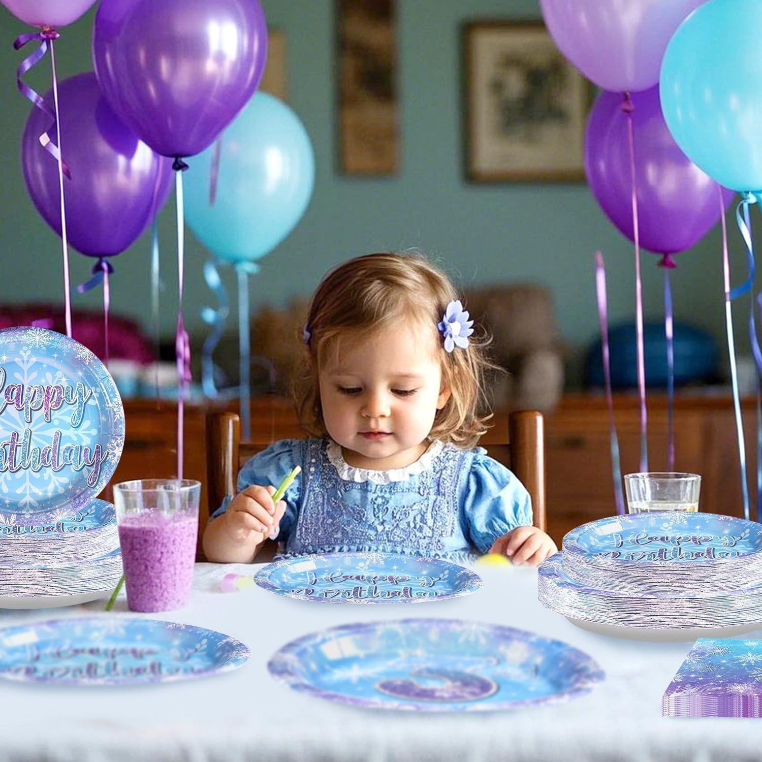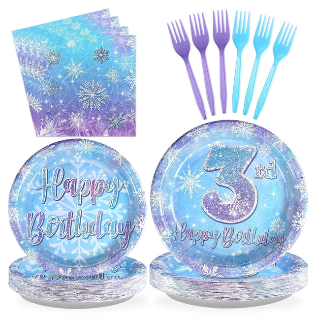 - Frozen Party Supplies: Use our 96 pcs winter onderland party tableware set to turn your kids' 3rd birthday party into a winter onderland! Each snowflake birthday plates set includes 24 9" frozen plates, 24 7" frozen dessert plates, 24 frozen napkins and 24 forks, enough to meet your needs for a frozen birthday party. Get ready to enter the world of ice and snow