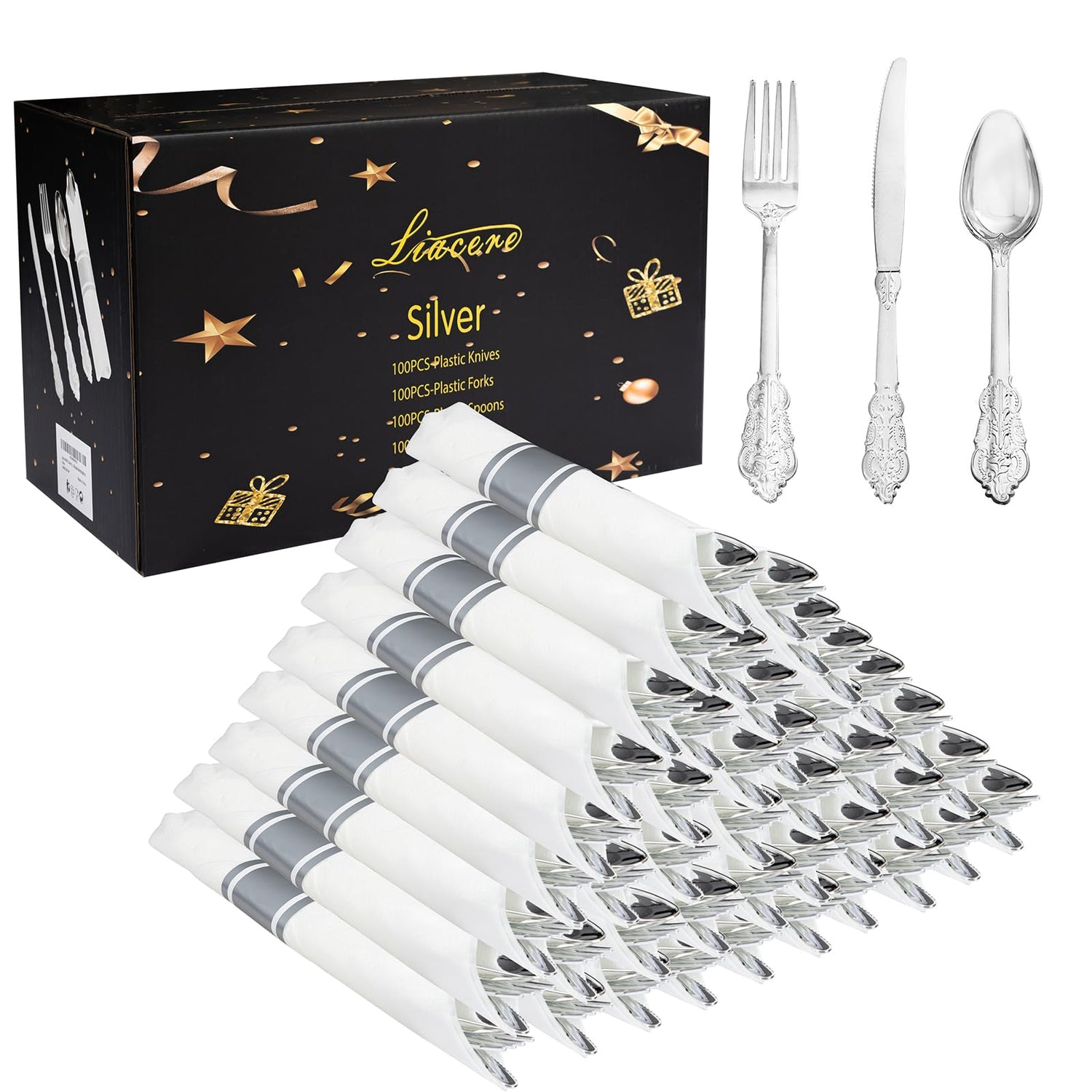 Liacere 400PCS Silver Plastic Silverware - Pre Rolled Napkins Disposable Silver Cutlery-Premium Quality Gold Plastic Utensils - Includes 100Forks,100Knives,100Spoons,100Napkins&Christmas is backordered and will ship as soon as it is back in stock.