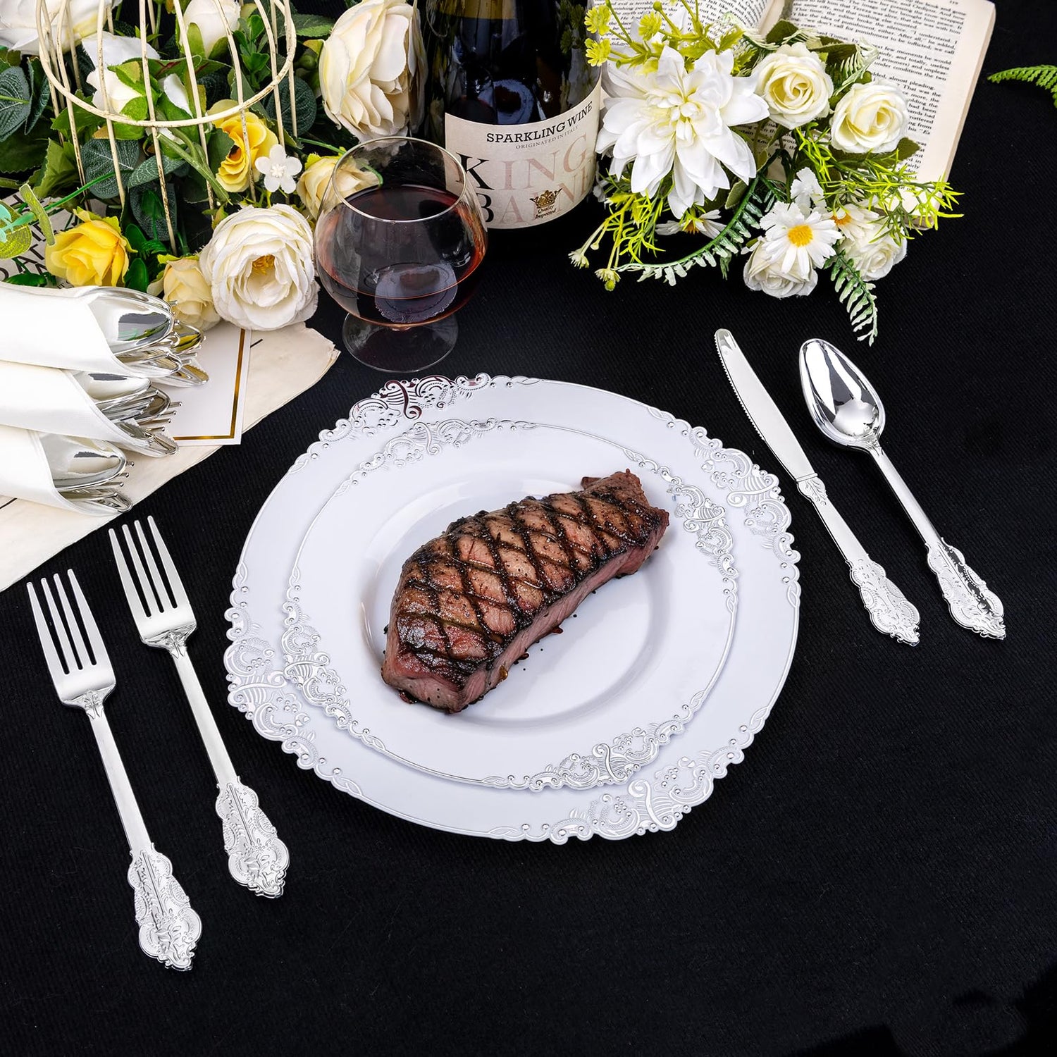 - Premium Material:Our silver plastic silverware made of heavy-duty plastic,sturdy and durable.The silver utensils is food grade ,You can use it without any worries