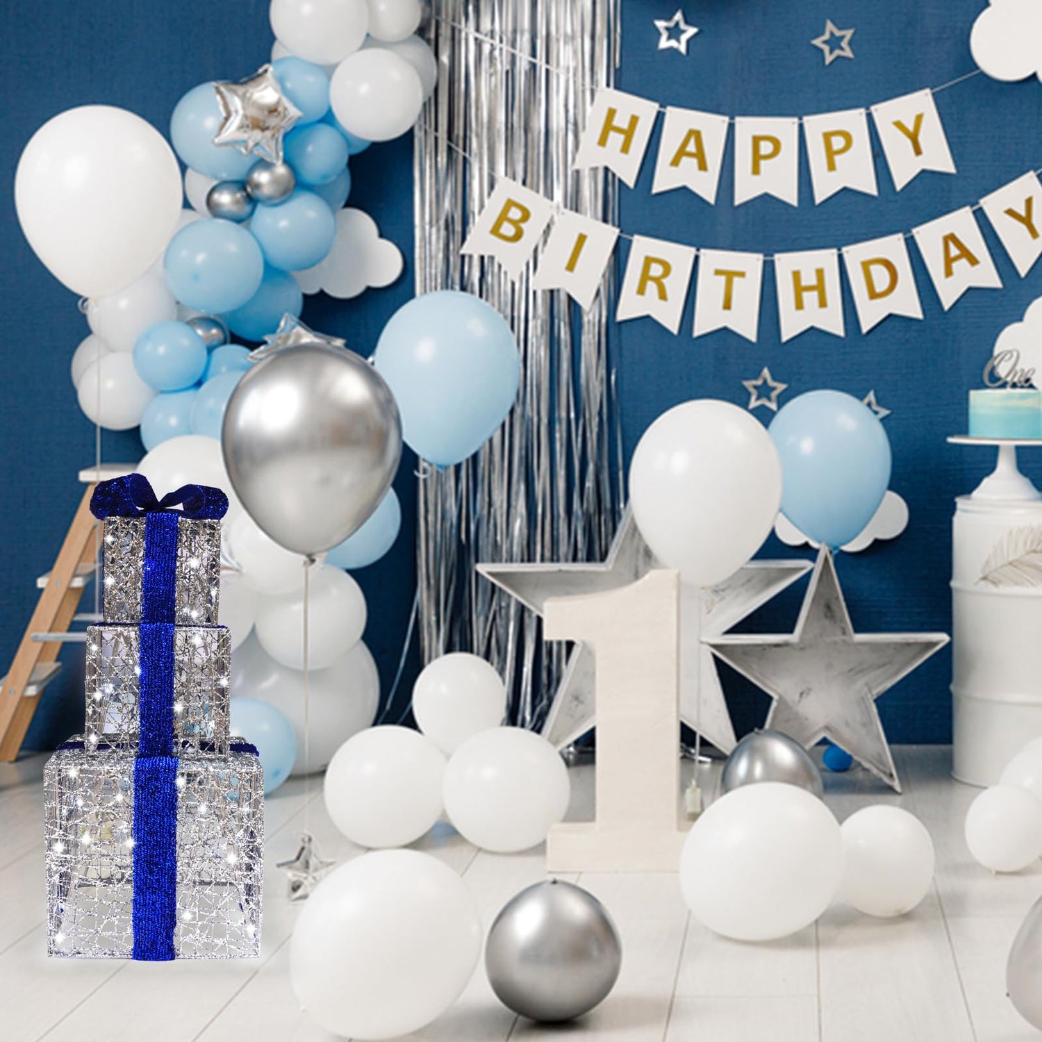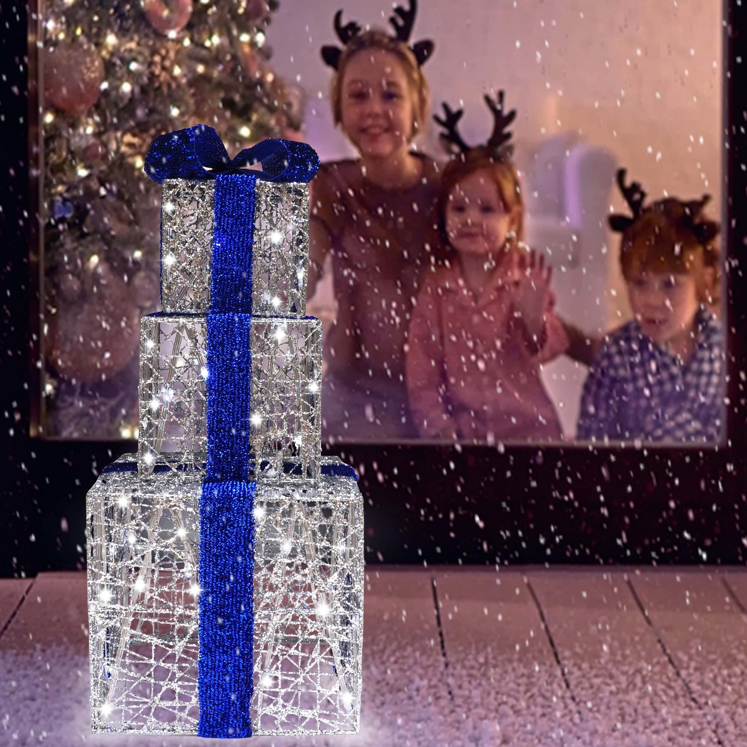 Lighted Gift Boxes Set of 3, Silver Boxes with Bow, Prelit 60 White Lights Present Box Lighted Display with Plug for Home Porch Outdoor Yard Christmas Decorations-Blue
