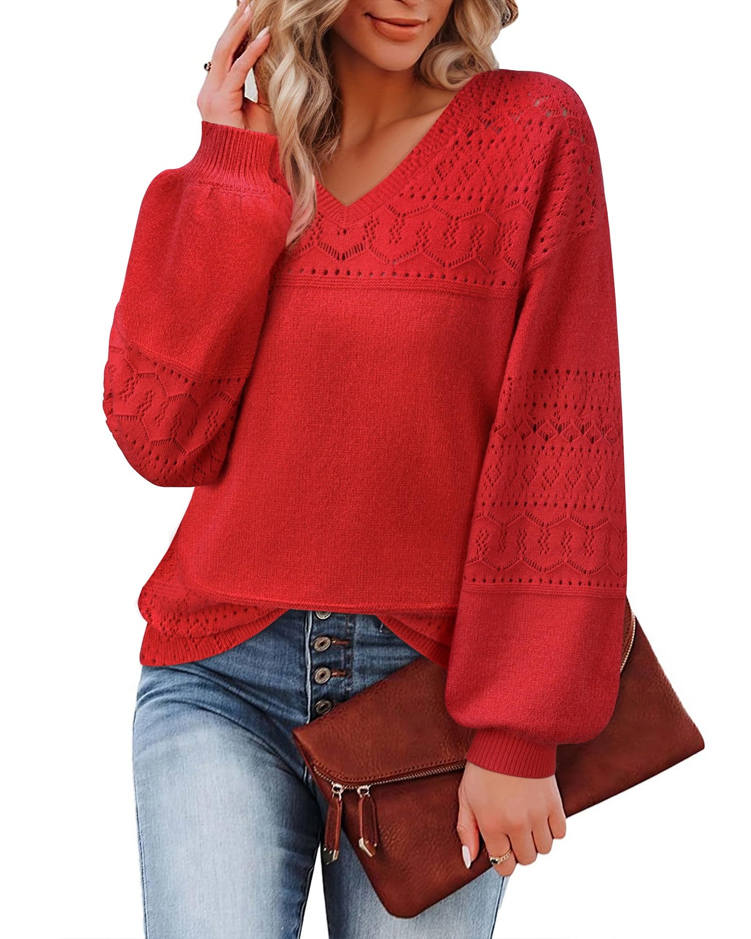 - šFEATURES: Long Sleeve Sweater For Women/V Neck Pullover For Women/Raglan Shoulder Lantern Sleeve Knitted Pullover Sweater For Women/Solid Color Business Casual Tops For Women/ Lightweight Knit Sweaters For Women/Hollow Out Crochet Sweater For Women/Casual Jumper Tops For Women/Work Business Pullover Shirts/ Knitwear Casual Style.