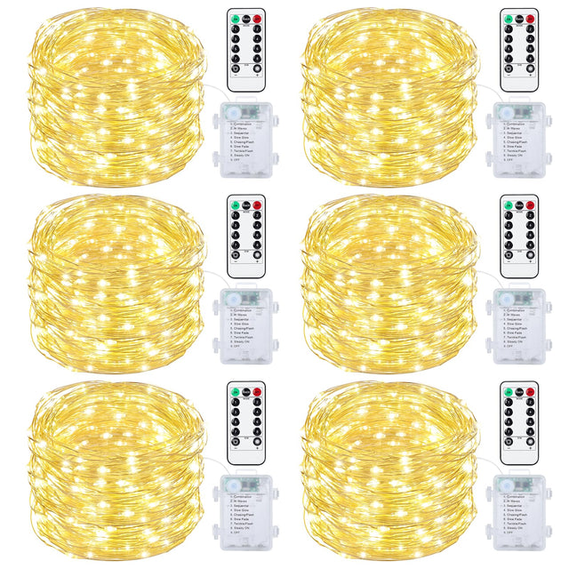 - Warm white 6 pack 33FT fairy lights with 600 leds: Mlambert fairy lights feature 100 warm white LEDs in silver wires per string, battery operated, come with remote and timer, you can easily control the ambiance of your space, making them perfect for any indoor and outdoor setting. Totally 198ft, you'll have plenty of lights to make your backyard a twinkling oasis at night.
