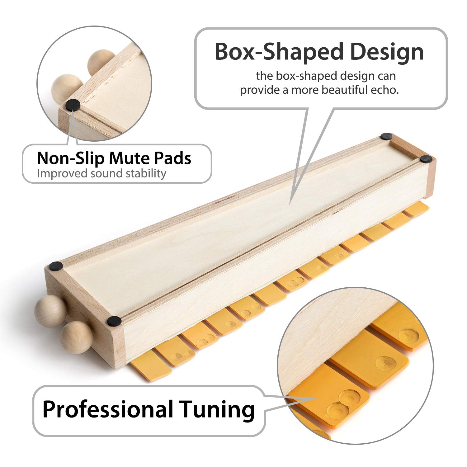 - 🔔Scientific Design: Size:13.5 * (2.5/4) * 1.5 Inch. This xylophone uses a box-shaped design to make the echo better. And the mallets can be stored in the bar, not easily lost. With the upgrade non-slip EVA pads, further improved the stability of the sound.