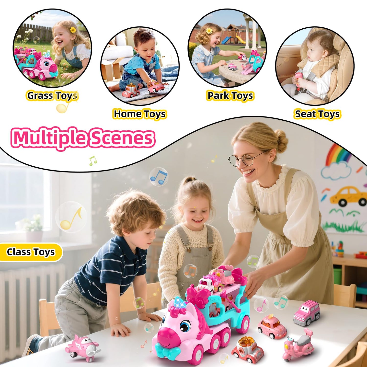 • 7 in 1 Truck Toy Set - The Newcrave Cartoon Transport Truck set includes 1 large cartoon truck and 6 cute mini princess cars. The girl will become a truck driver and lead the truck forward. Truck Toys for 1 2 3 years old girls will bring more fun.