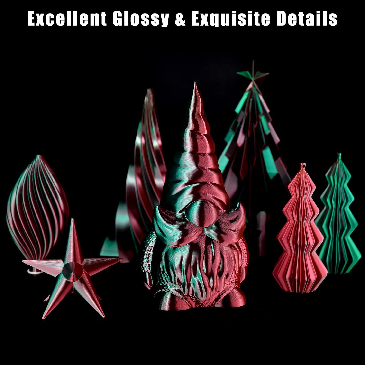 - 【Dual Color PLA Filament】Different from normal color change rainbow PLA filament, every inch of this magic 3d filament is made of 2 colors-Red and Green. Therefore, you will easily get all colors, even for very small prints. Different prints will present different effects. Enjoy your 3d printing creations.