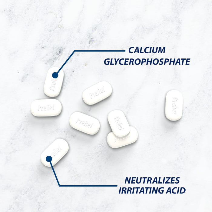 • Drug Free: A good source of calcium, Prelief can be taken as often as you think you will need it; Taking 2 to 3 Prelief caplets with your food or drink can reduce the acid and minimize discomfort