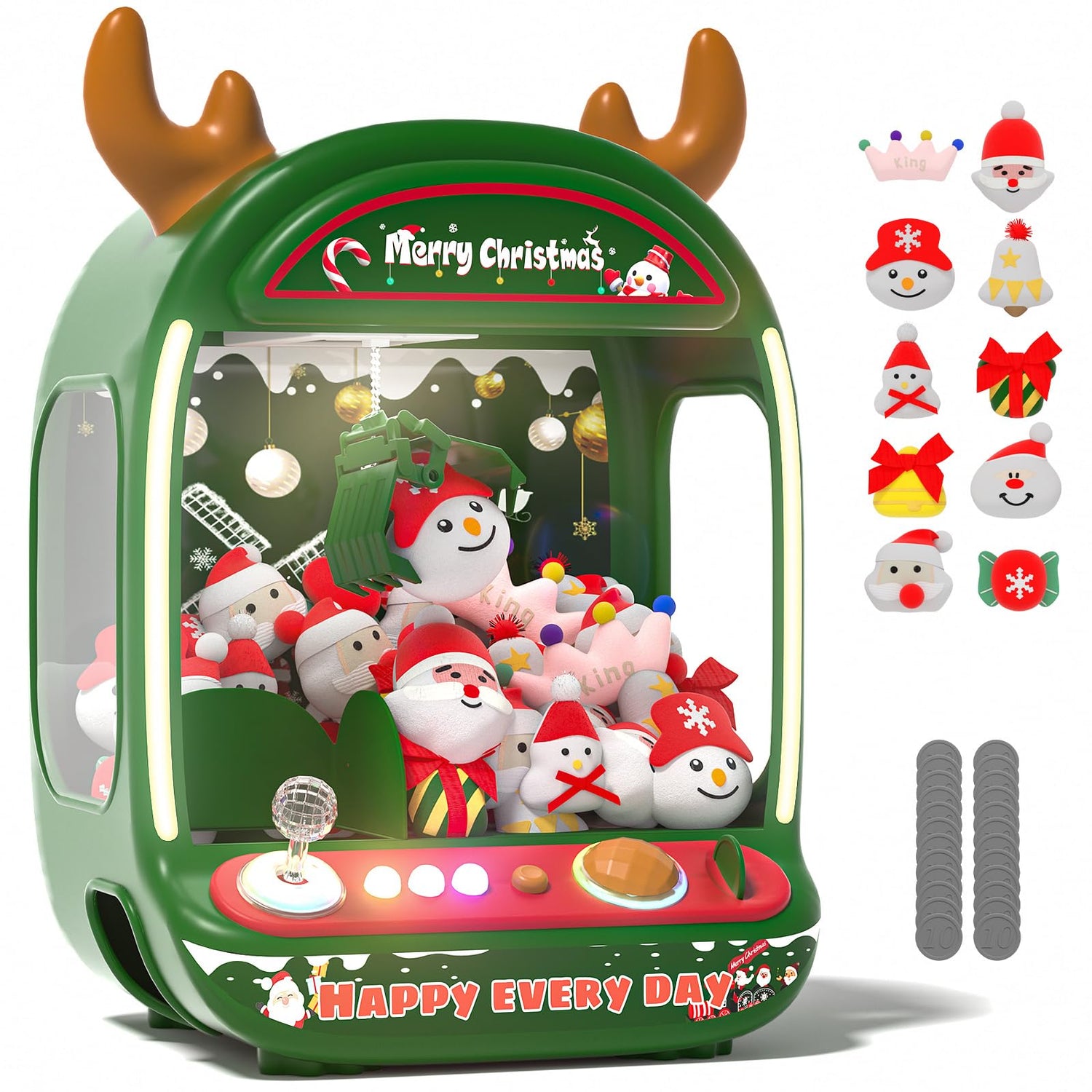 - The Ultimate Christmas Party Game and Decoration: Specially designed for the holiday season, this Christmas-themed claw machine is filled with adorable plush prizes like Santa, snowmen, and gift boxes, making it the perfect addition to family gatherings and festive parties. With its reindeer antlers, holiday lights, and classic colors, it doubles as a charming decoration that adds to the holiday ambiance. Easy to use and fun for all ages, this interactive game brings excitement, creates joyful memories, and spreads holiday cheer, making it an unforgettable part of any Christmas celebration.