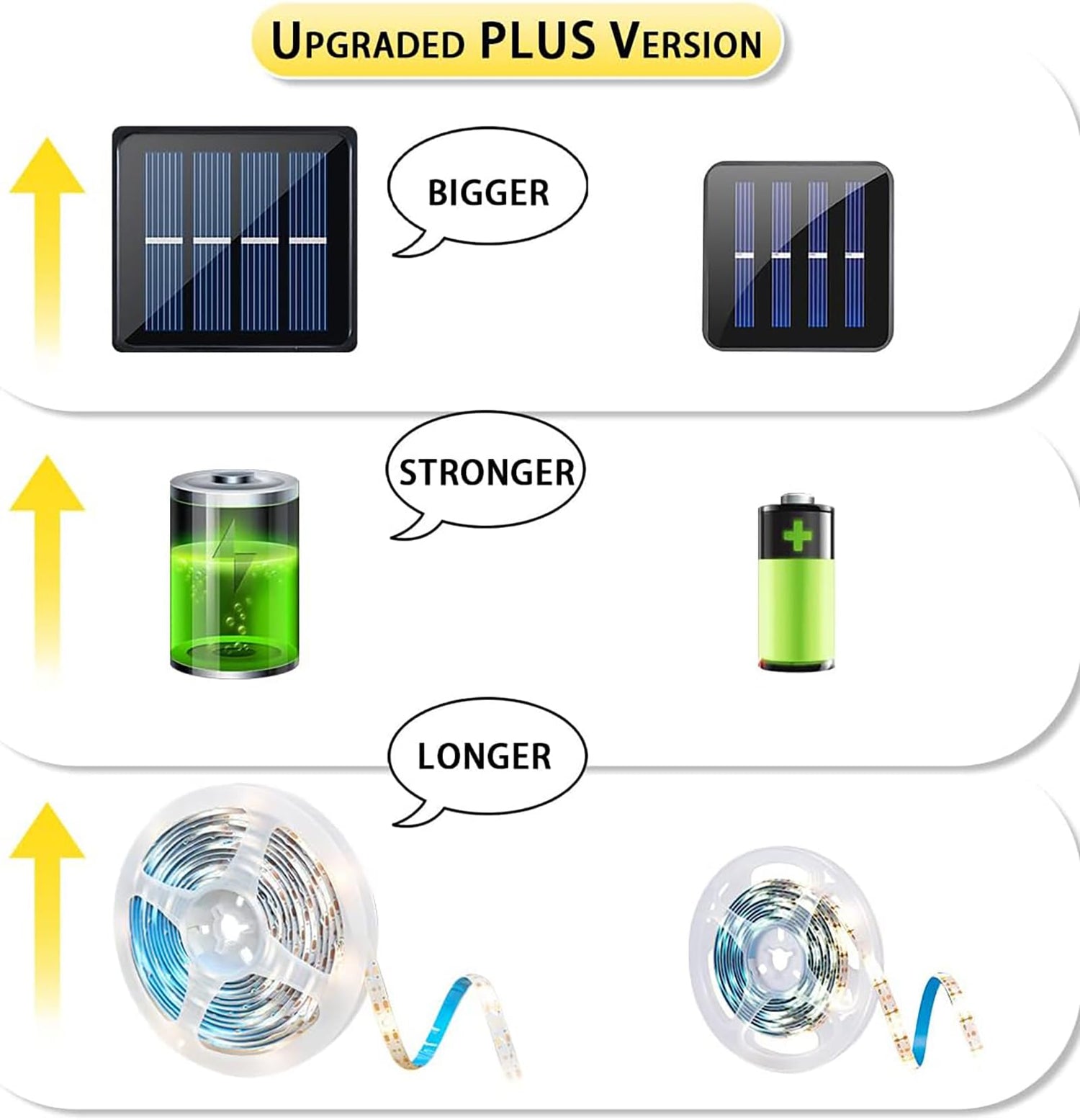 - 【Upgraded Version, Longer, Larger, And Stronger】This solar powered light strip has been upgraded with a larger solar panel size of 3.5 inches, increased battery capacity of 1800 milliampere-hours, extended size to 19.7 feet, and an upgraded number of LED lights to 180, making it look small but with sufficient energy