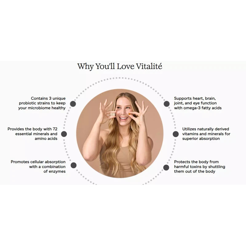 Vitalité is a powerful, daily supplement that works at the cellular level to deliver the essential nutrients your body needs to perform at its best every day.