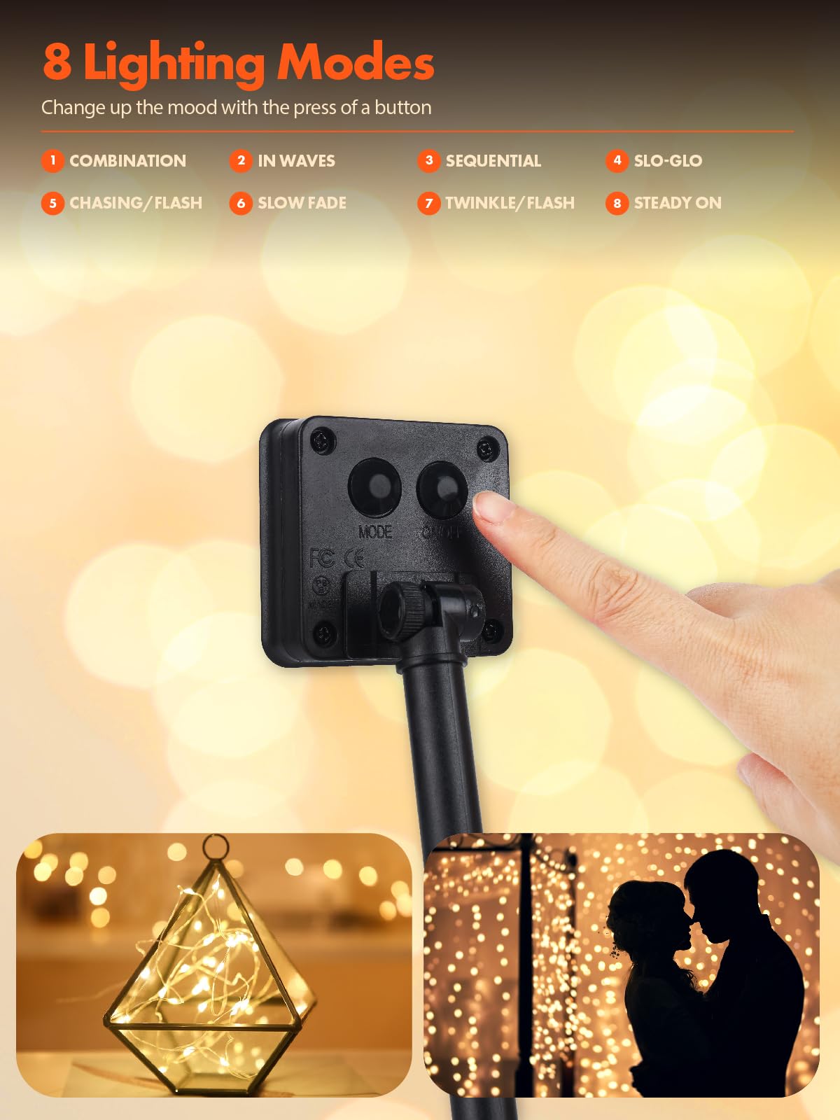 - 8 Lighting Modes with Memory Function: Our solar string lights have 8 lighting modes for you to choose: combination, in waves, sequential, slo glo, chasing/flash, slow fade, twinkle/flash, and steady on. Comes with memory function, remember last setting automatically after turn off the power, no need to reset again.