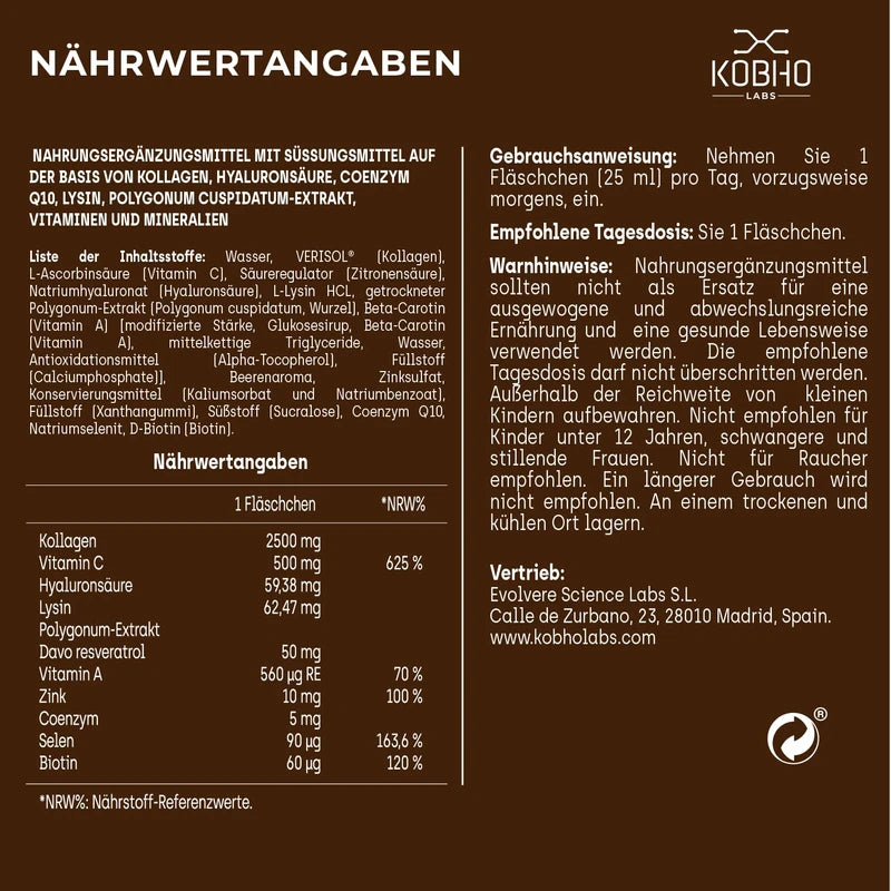 - Drinking chamber collagen with safe dose: at Kobho Labs we comply with all maximum doses permitted at European level to ensure your safety. In addition, our specialist staff manufactures our dietary supplements for men and women to the highest quality standards, and our company is registered in Spain under the RGSEAA number: 26.022685/M.