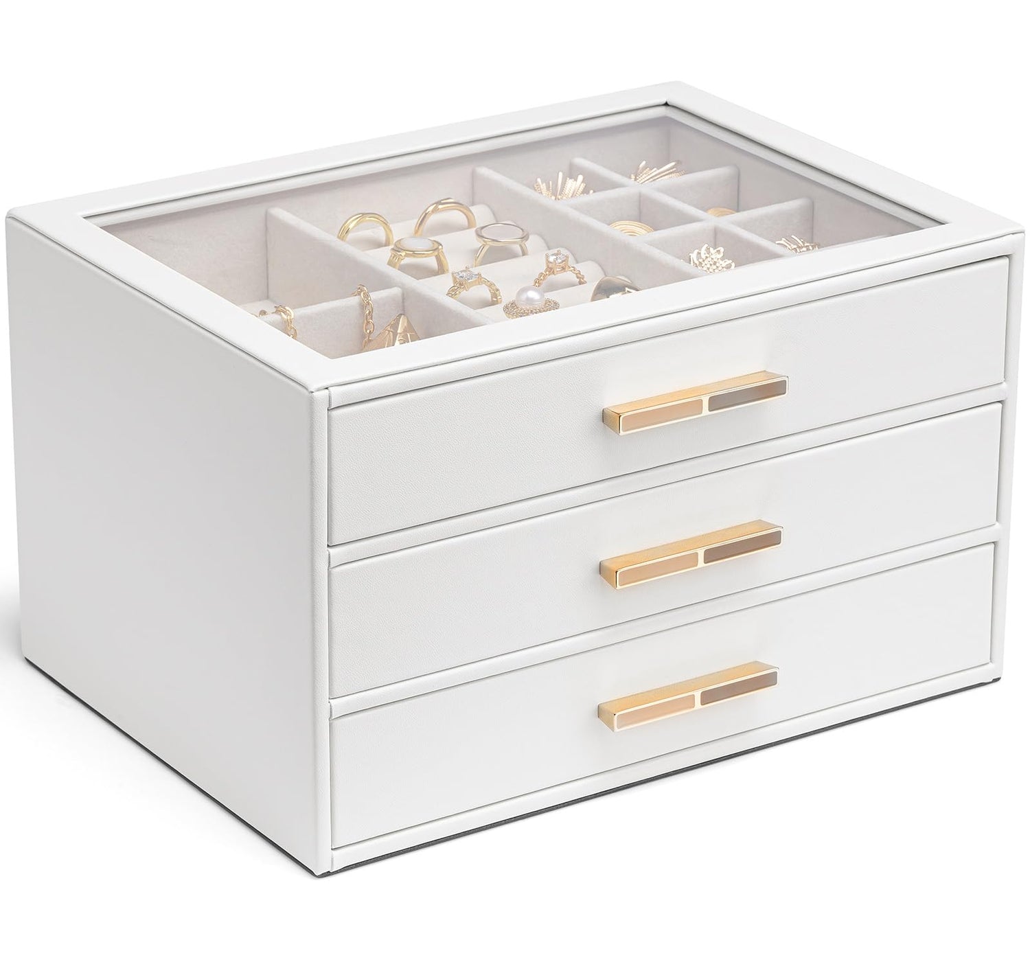 Vlando Jewelry Box for Women, Glass Lid Jewelry Organizer with 3 Drawers for Necklaces Rings Earrings Bracelets Christmas Gift - White