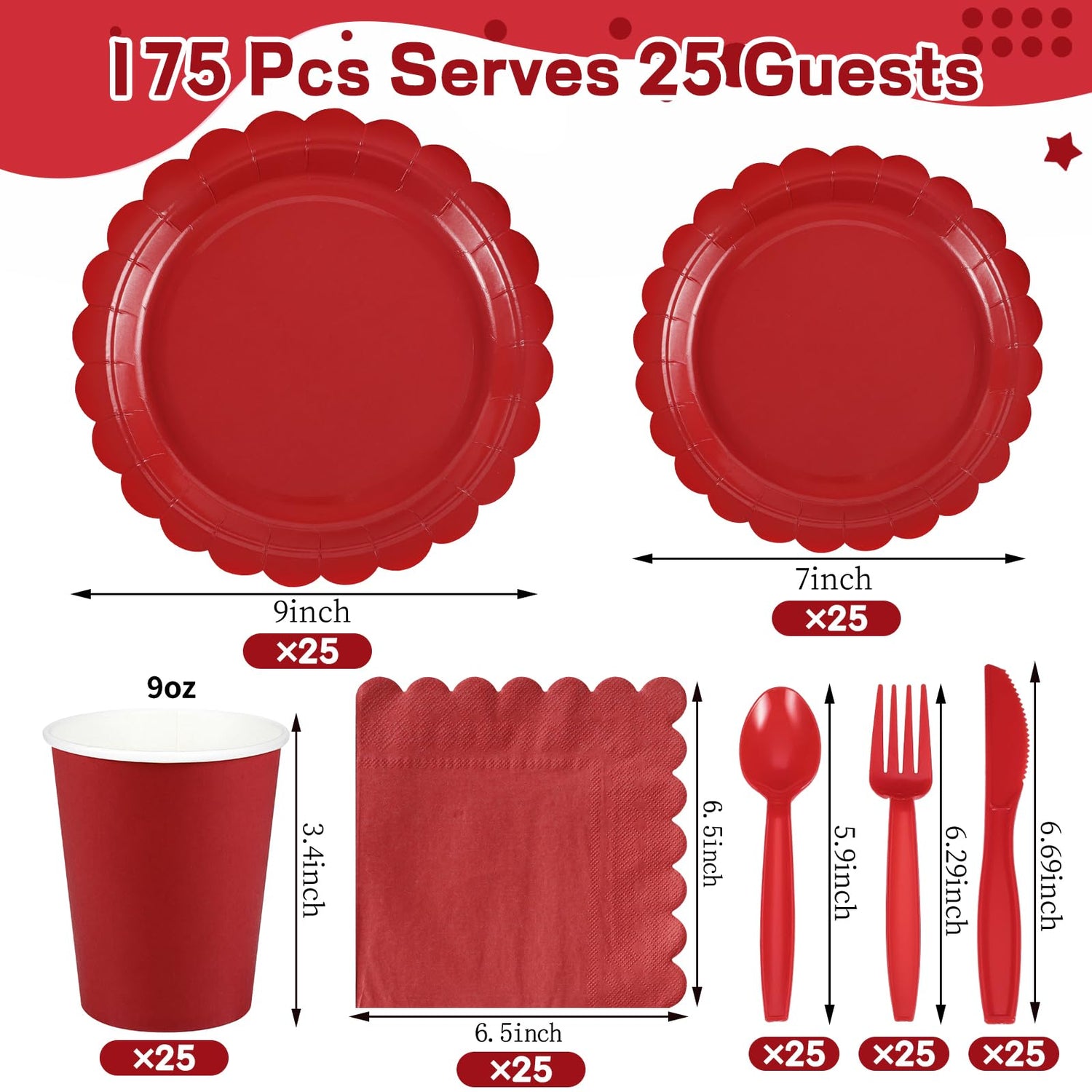 - 175 Pcs Red Party Supplies Set:Includes 25 x 9 inch red plates, 25 x 7 inch red dessert plates, 25 x 9 ounce red cups, 25 x 6.5 inch red napkins, 25 plastic forks, 25 knives, and 25 tablespoons
