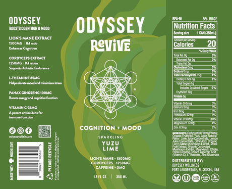 Odyssey Revive combines L-Theanine, Lion’s Mane, Cordyceps, and electrolytes into a caffeine-free drink for hydration and calm focus. The Yuzu Lime flavor offers zesty freshness while adaptogens promote endurance and clarity.