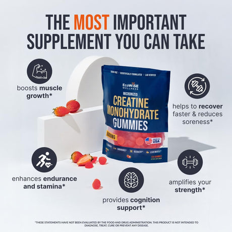 The EcoWise Wellness Creatine Gummies offer 5000mg of creatine monohydrate per serving in a sugar-free, vegan, mango-flavored chewable format. Designed for both men and women, these gummies aim to improve muscle performance, strength, and energy levels while simplifying daily supplementation.