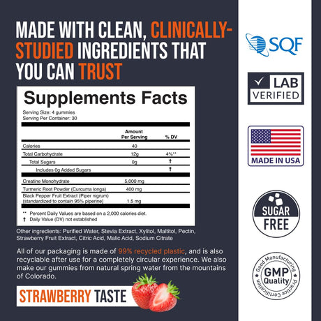 Most gummies contain 5g of creatine per serving, which is the standard effective dose for enhancing muscle strength and workout energy.