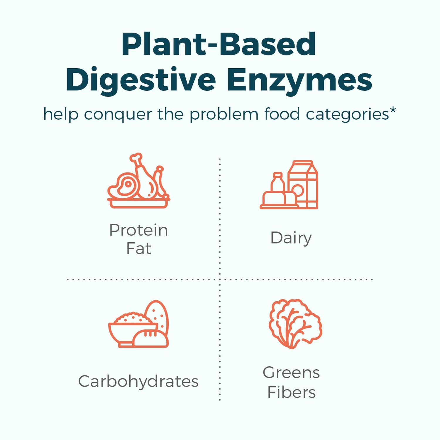 - Plant-Based Digestive Enzymes: NewRhythm Digestive Enzymes is formulated with 7 major enzymes from plant sources to support optimal digestion for a wide range of food groups, including protease, bromelain & papain for protein, amylase for carbohydrates, lactase for lactose, cellulase for fibers and lipase for fats. Specially added probiotics and desirable prebiotic XOS work synergistically with enzymes for ultimate GI support.*