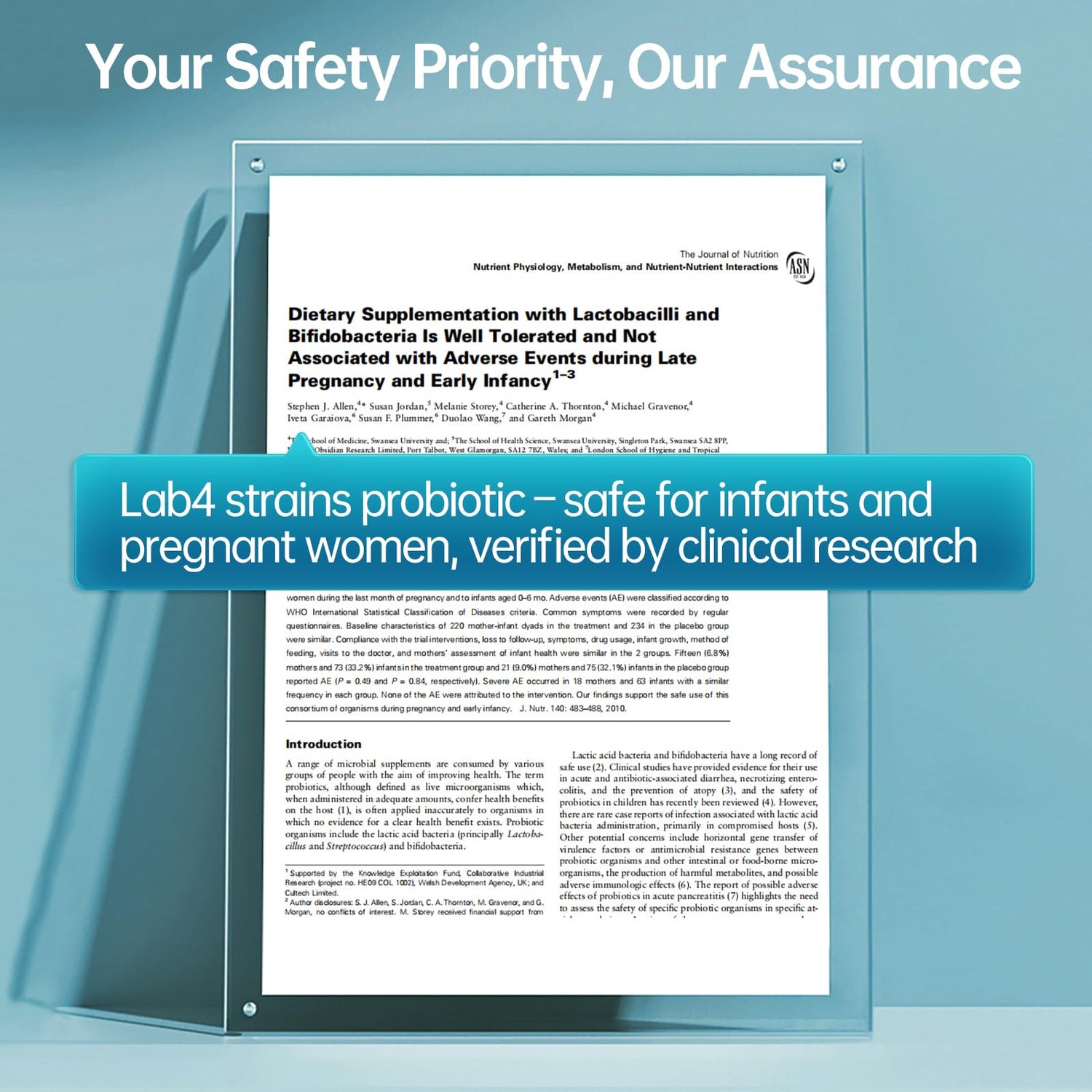 - SAFE AND RELIABLE: Lab4 strains have received special approval for clinical trials with pregnant women and infants, proving safe for these sensitive groups. Free from gluten, dairy, GMOs, and preservatives, it is suitable for long-term use to support your gut health. 1 capsule a day, 60 days supply