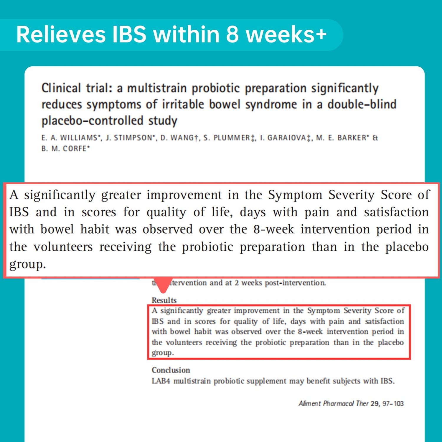 - RELIEF FOR IBS SYMPTOMS: Backed by research from the U.S. National Library of Medicine, Lab4 probiotics - a clinically studied blend - target the root causes of IBS, including diarrhea (IBS-D and traveler's diarrhea), constipation, gas, bloating, and abdominal discomfort. In just 8 weeks, this daily probiotic supplement for women and men helps improve stool consistency, reduce bathroom visits, and restore long-term digestive balance