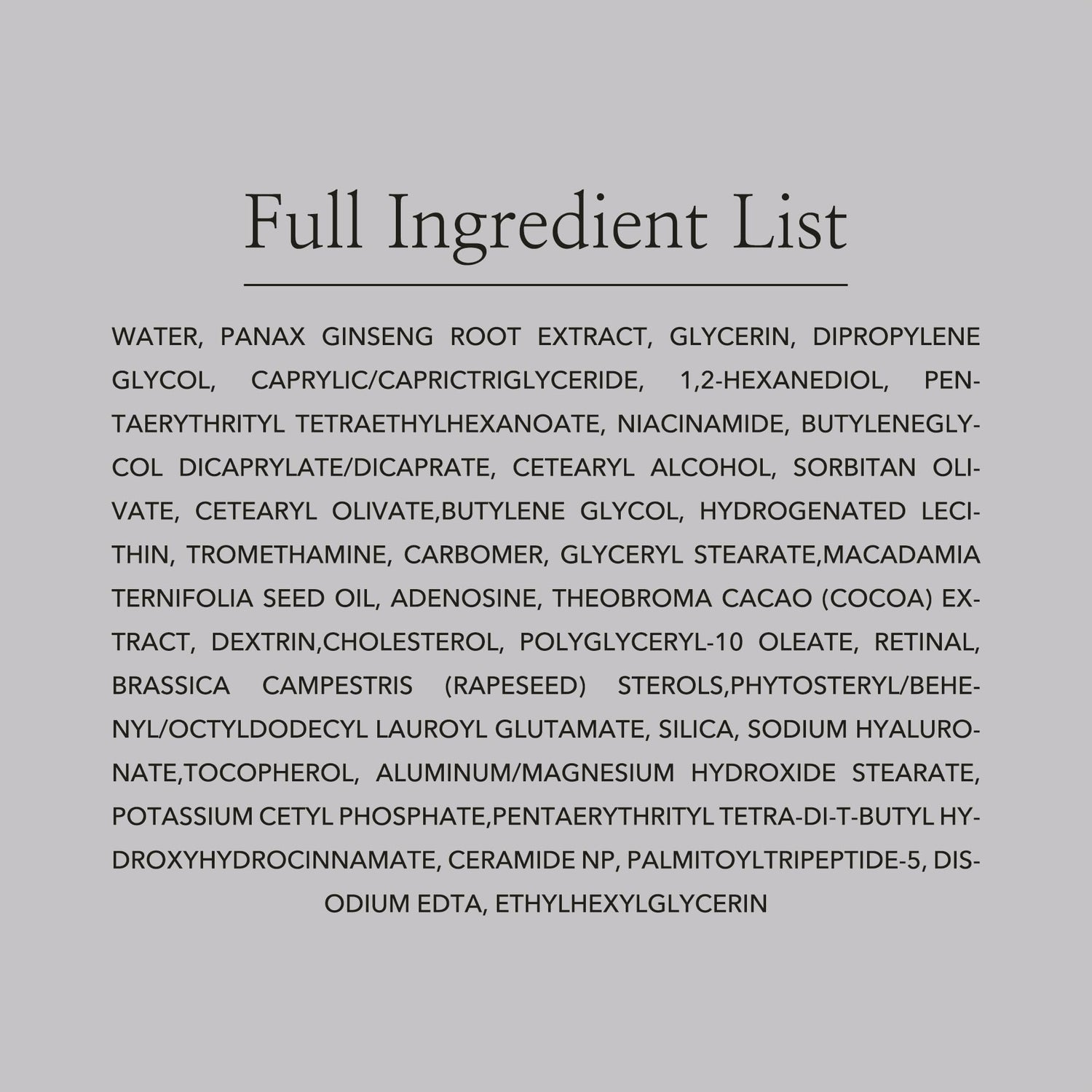 • Key Ingredients: Ginseng Extract for skin elasticity and protection, Retinal for reduction of wrinkles and Niacinamide for brightness