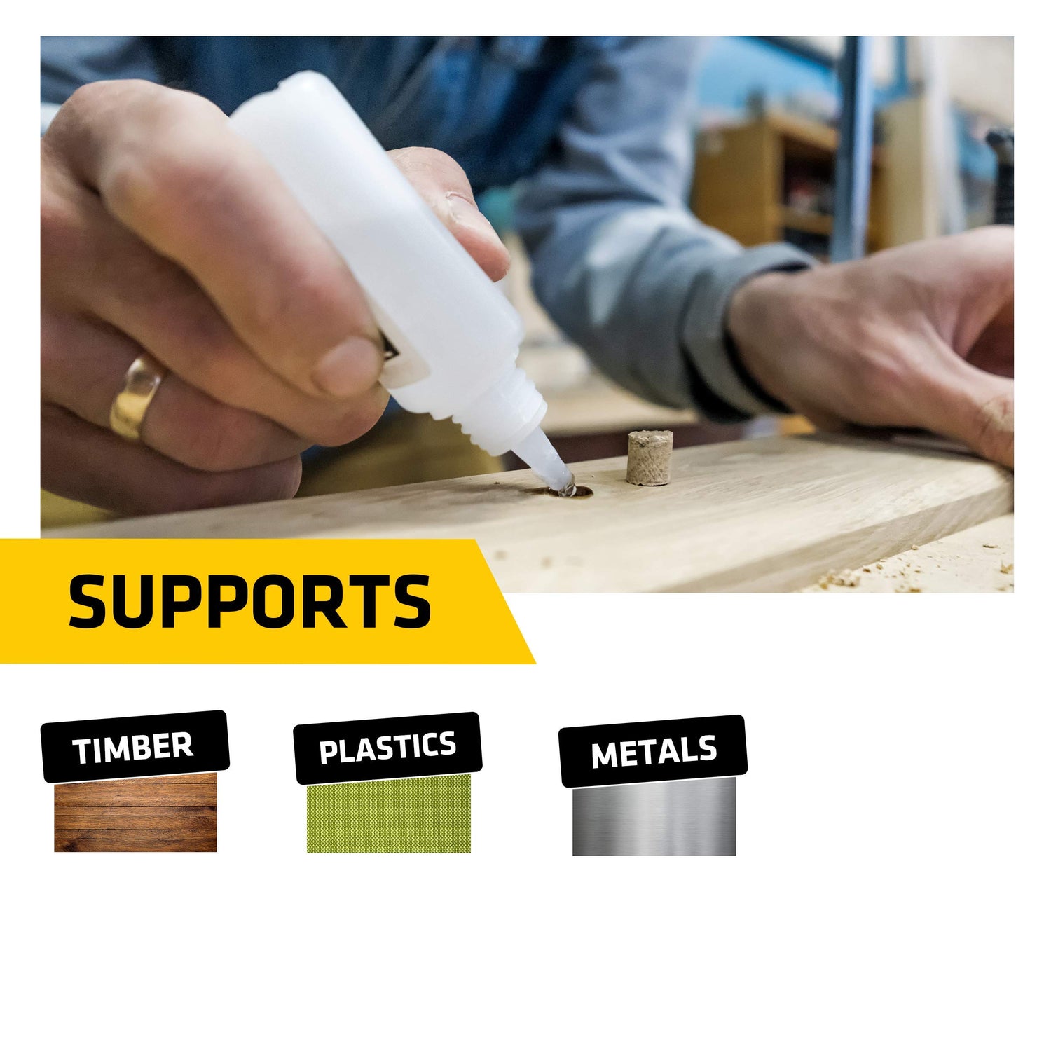 - High viscosity adhesive – low soak in to give greater bond strength than conventional cyanoacrylates on porous surfaces (e.g wood)