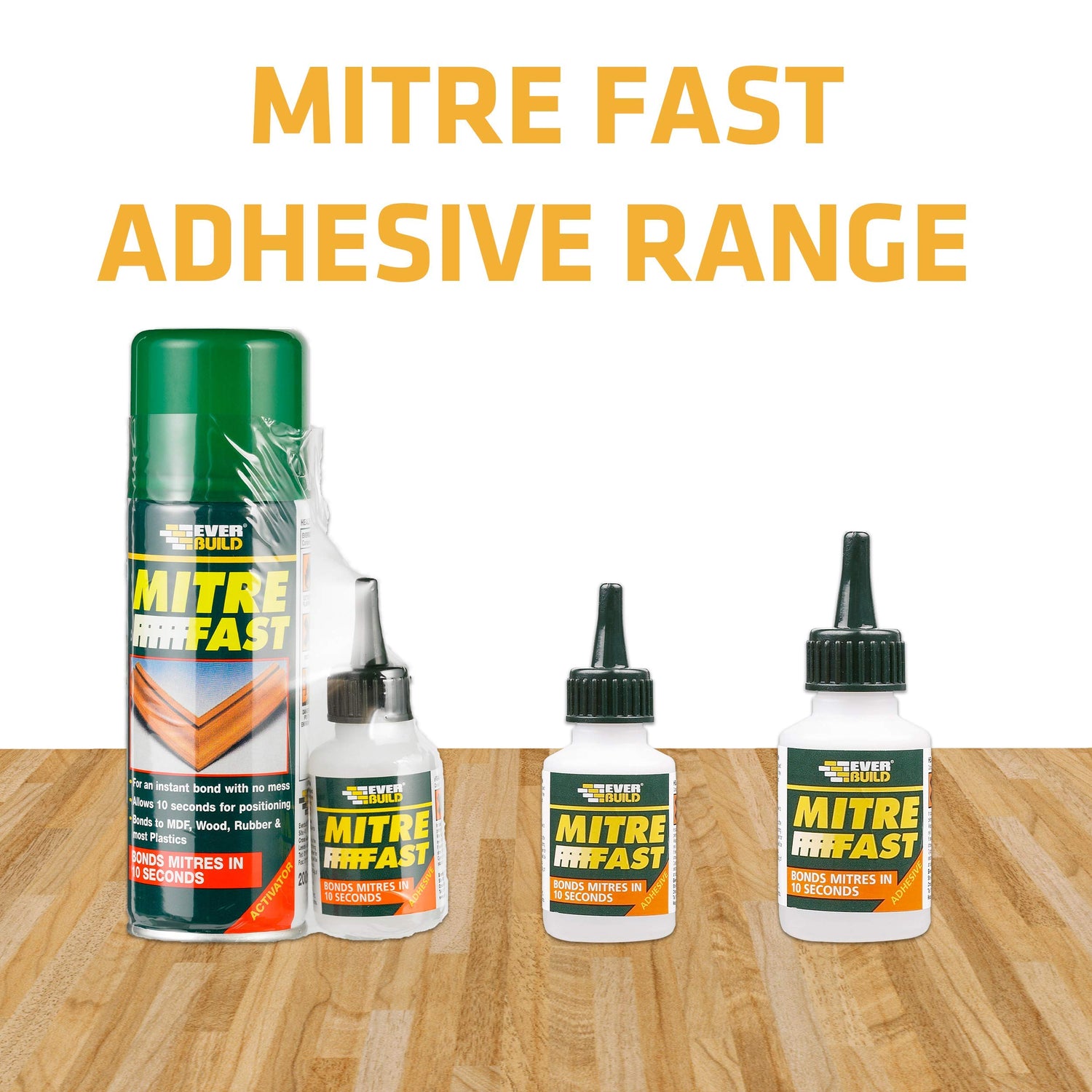Details: Everbuild Mitre Fast Two Part Bonding Kit is a two-part instant adhesive system containing cyanoacrylate adhesive and an aerosol activator. Use this solvent-based adhesive to bond a wide variety of materials, including MDF, rubber, chipboard, plastics, PVCu, Perspex, metals and ceramics. It's ideal for use with furniture, timber, kitchen and plastics applications, where the instant bonding properties dramatically reduce assembly times for mitre joints when compared to conventional wood adhesives. It's also great for use with cornice and profile mitres, trims, picture frames, skirting and architrave joints, worktop end strips, uPVC window trim bonding, and more.