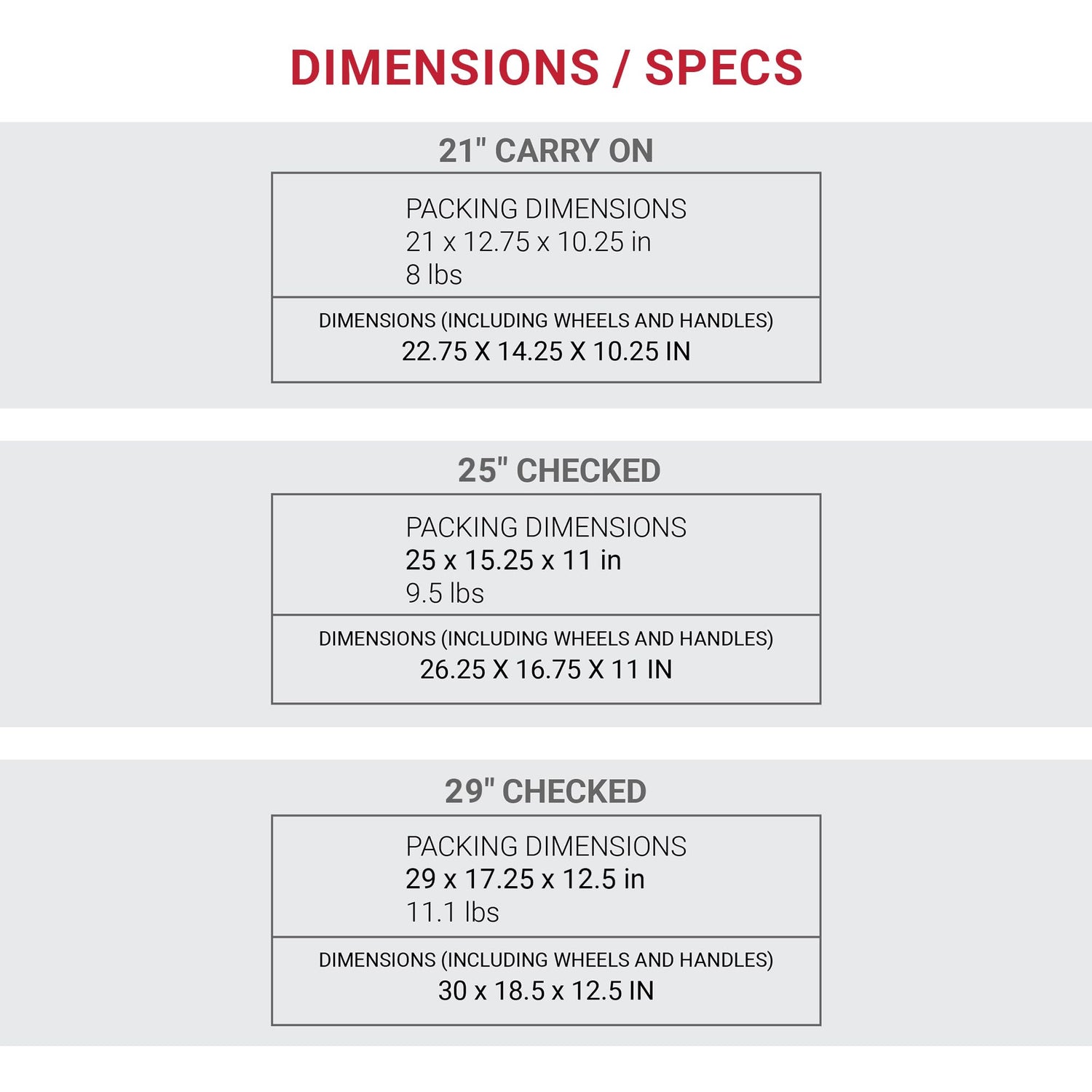 - 3-Piece Luggage Set: Every inch counts when it comes to fitting last minute gifts into your luggage – the Swissgear Sion Expandable Spinner Luggage Collection – containing a 21" carry-on, 25" and 29" suitcases–expands to give you an ample amount of packing space when needed