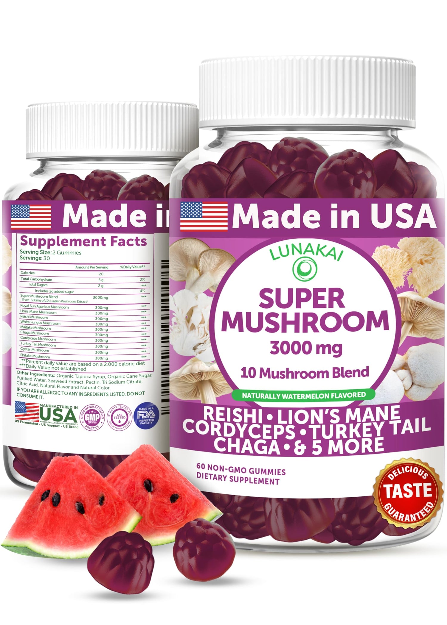 Lunakai USA Made Super Mushroom Gummies for Adults – 10-in-1 Adaptogenic Mushroom Supplement with Lion's Mane - Focus & Brain Support, 60ct